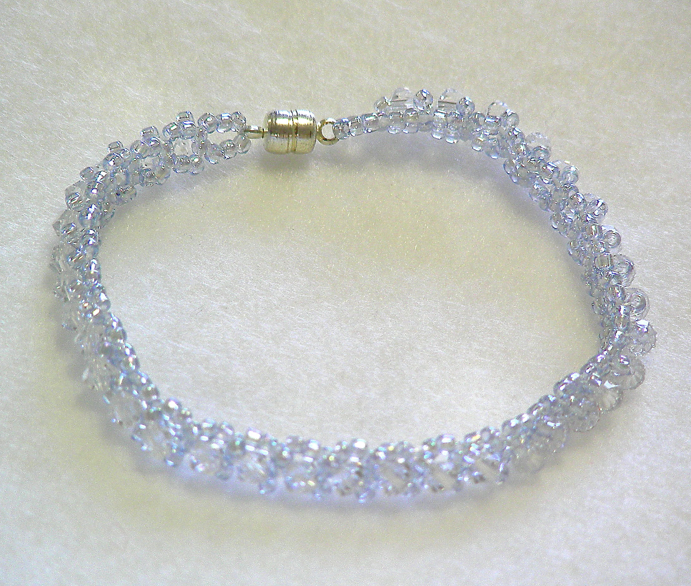 Finally (and I’ve saved the best for last), Sharla included one of her own beaded crystal bracelets in my package. It is so dainty, and it fastens easily and securely with a magnetic clasp. The photo below, to be honest, does not do the pretty bracelet justice. And it just happens to match a brooch I received from a family member for Christmas!