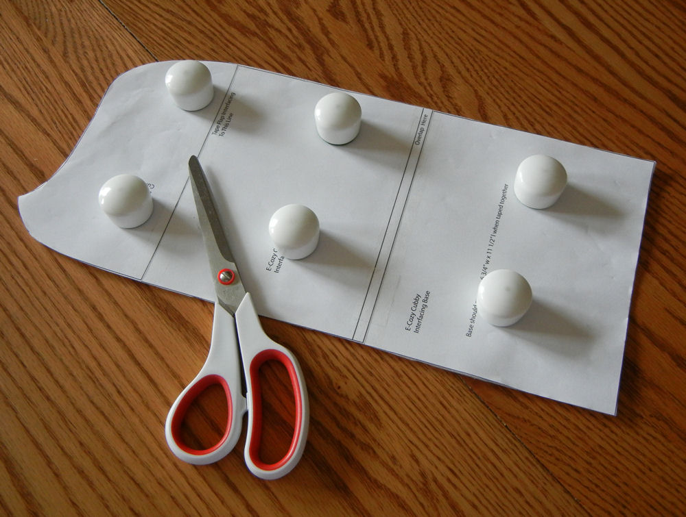 My eReader pattern suggested the use of a craft-weight stabilizer called Peltex 70 that is often used for making bags. While my local fabric stores carry it, it is rather expensive, so I prefer to use a lookalike brand in the same weight from Long Creek Mills that I buy in bulk at wholesale cost. You’ll notice that I used fabric weights instead of pins to place my pattern on the stabilizer, which makes the cutting process fast and easy. If you don’t have fabric weights, you can substitute canned goods.