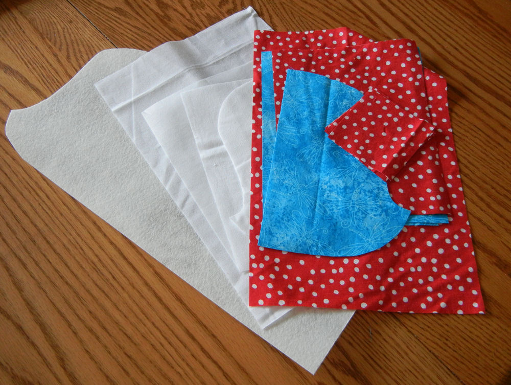 I started off by pre-washing and drying red and turquoise fabrics. Although I like the crispness that accompanies store-bought fabrics, in the back of my mind I always think about the fact that anything I sew will eventually need to be washed. Once cotton is washed for the first time, it always shrinks, and I sure would hate for that to happen after I have finished an item! Besides, you can always add crispness to fabric with spray starch. Once my fabrics were washed and dried, I cut out both the fabric and interfacing pieces.