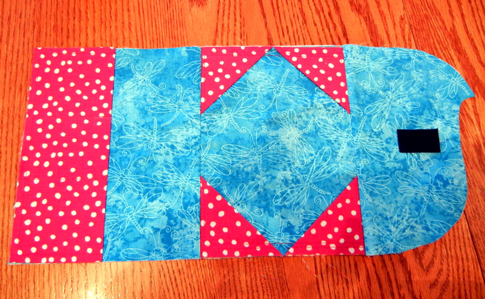 I pieced together the pieces for the inside of the cover: the left page, the right page, and the flap. You’ll notice a black hook-and-loop tape rectangle on the flap. I always wish this tape came in a greater range of colors, but on the other hand, who is going to see it once the cover is closed?
