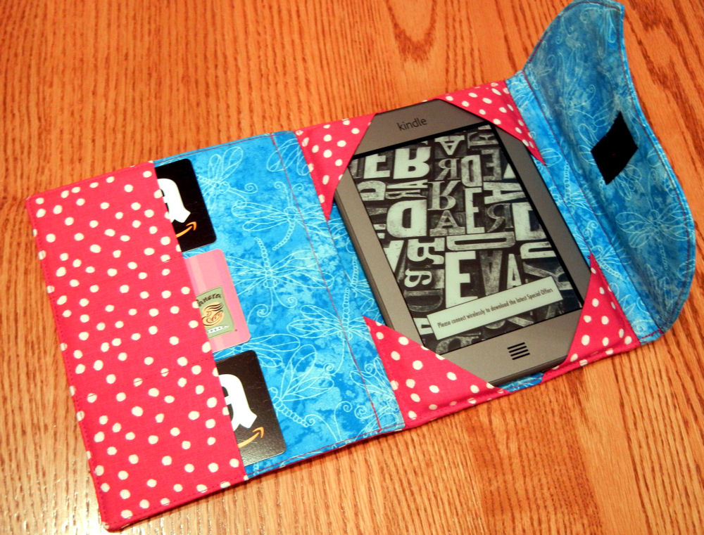 I sewed a folded rectangle to the left inside page of the cover and divided it into 3 pockets. The pockets are the right size for gift cards or credit cards, so if you want to take your eReader to a coffee shop, you can bring along payment for a coffee and snack at the same time.