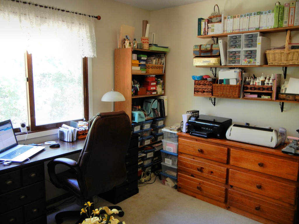 While Iowa lawns and fields have been scorched during high-90s and 100+ temperatures, I’ve been buried in paper (literally) inside my air-conditioned paper crafting studio. A little over a month ago, I ordered a lovely new desk from Pottery Barn and was thankful to learn it would take several weeks to get to me. A delayed delivery may not sound like a reason to celebrate, but you didn’t see what my paper crafting room looked like a few weeks ago. Embarrassing, to say the least! In any event, the desk has now arrived, and the room is tidier than I’ve ever seen it. In fact, I’m not sure it even belongs to me. Take a look now, since it won’t last! I am, after all, the Queen of Piles.