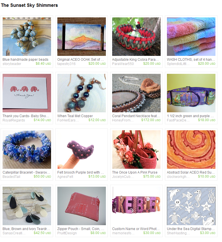 Meanwhile, I’ve fallen behind in thanking the Etsy curators who included my handmade items in their Treasuries while I was involved in my clean-up project. Please take the time to visit their shops by clicking on the Treasury below that will take you to their individual handmade items. Thank you again, everyone!