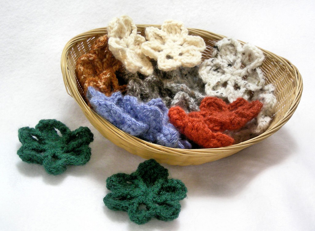 Because it’s more efficient, I generally make the body of the gloves in various colors, then crochet the flowers in pairs to match them.
