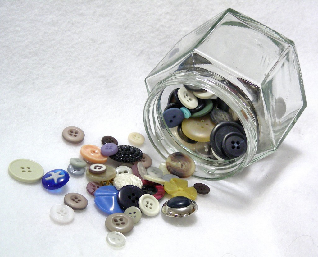 The last step of the process is sewing a button to the center of each flower. This also serves to attach them to the body of the fingerless gloves. I always enjoy browsing through my button stash.