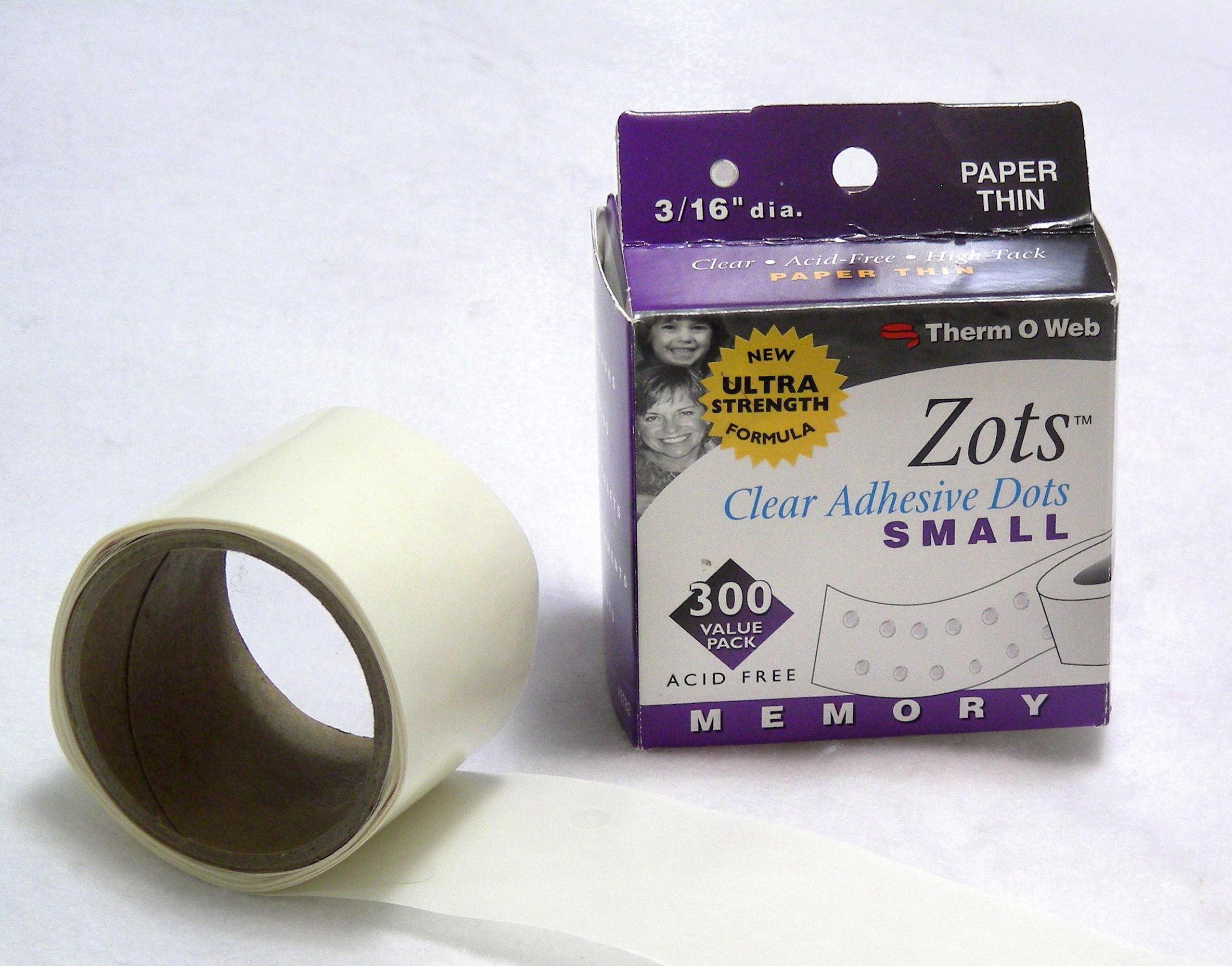 When it comes to adhering small embellishments to paper, card stock or chipboard, I prefer to use Therm-0-Web Zotsâ„¢, acid-free clear dots of adhesive that come on a roll. You press your embellishment against the roll where a Zotâ„¢ is located, and it comes right off the non-stick roll. You get a lot of adhesive in a small box, and the Zotsâ„¢ are easy to apply and adhere well. Generally, you’ll find Zotsâ„¢ in scrapbooking and craft stores, and sometimes at fabric stores. The only drawback that accompanies Zotsâ„¢ is that these paper-thin dots are so tiny that they are difficult to see on the roll, and difficult to find if you drop them. I suppose that is why it’s recommended that you place your embellishment against the roll, rather than removing a Zotâ„¢ from the roll and adhering it to your item!