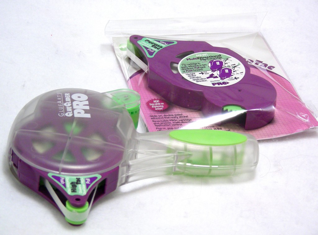 I really appreciate the ease of application that comes with the GlueArts® GlueGlider Pro. This is a replaceable cartridge glue that you insert in a very comfortable adhesive tape gun (ATG) dispenser. You roll a wheel that dispenses clear adhesive on your surface. I have not had any problems with the tape breaking. The cartridges come in Perma Tac (general purpose), High Tac (embellishments and Grunge Board), Repositionable Tac (paper and photos), and Extreme Tac (anything except paper, photos, plastic and Styrofoam). To change glues, just change the cartridge. Drawbacks are that the glue is expensive at the $8.99 retail price, it comes only in 40 to 58 feet rolls, and when the plastic cartridge is empty, you discard it—which ecologically isn’t very friendly. I would like to see if my local recycling program will accept these empty cartridges, but I suspect they do not. If you need a fast, strong tape runner tool and are looking for convenience, this is your adhesive. But be prepared to pay for convenience!