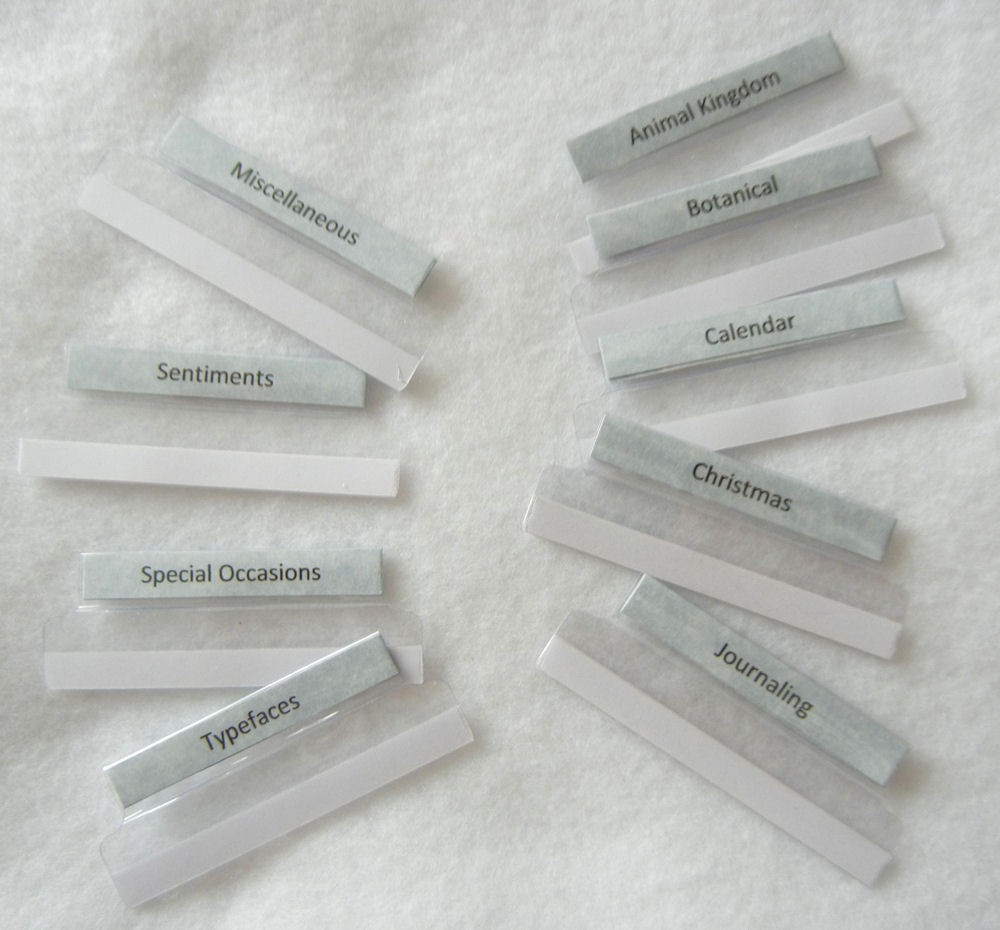 You may prefer to organize your stamps by manufacturer’s brand or according to the frequency you use them. There is not really a right or wrong way to do this, but this is what works for me. You can use Microsoft Word to accomplish the same task I did with Corel WordPerfect. The adhesive tab package, in fact, comes with perforated card stock that you can slide in your printer and then tear apart into individual tabs; the package usually contains instructions for how to set up and enter your labels using Microsoft Word software. I used color card stock instead because that made the tabs more visible inside my binder.