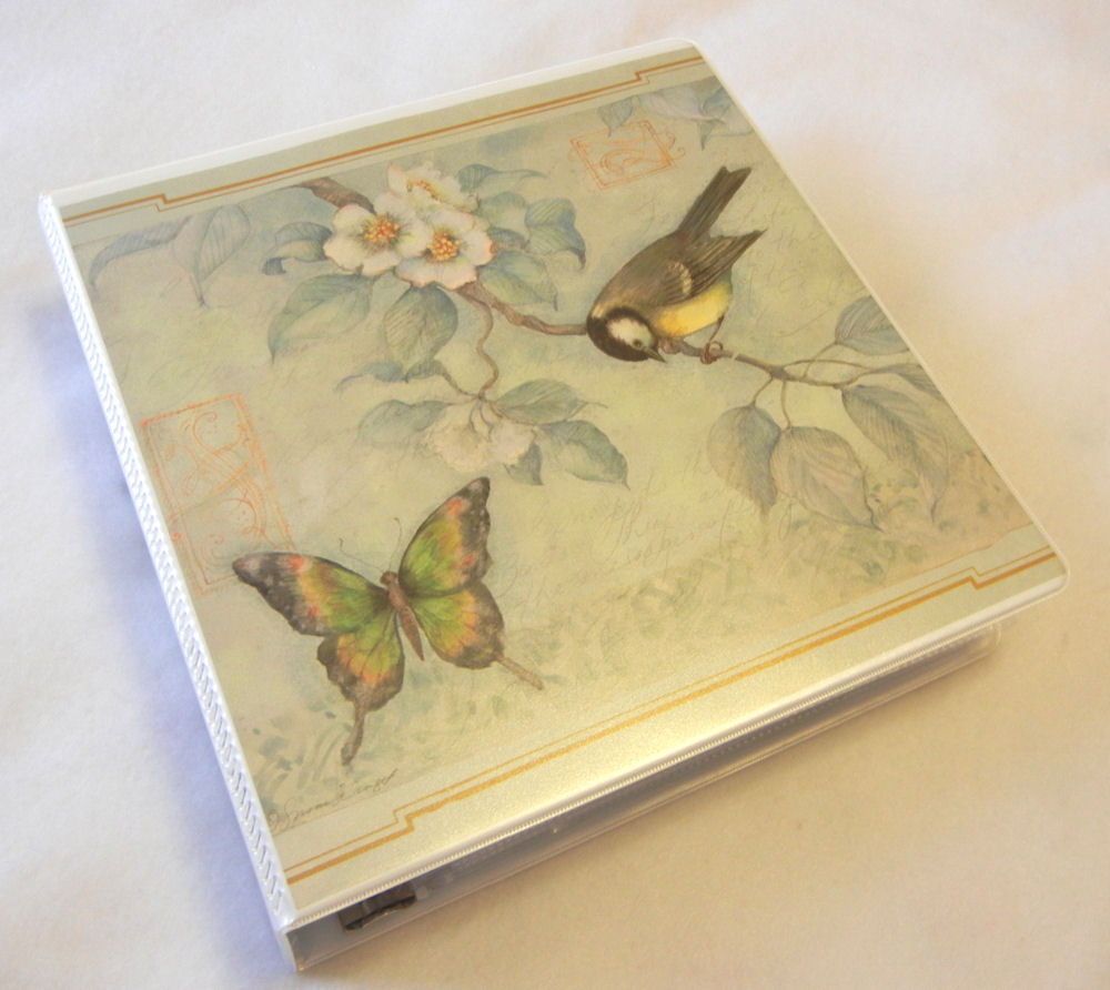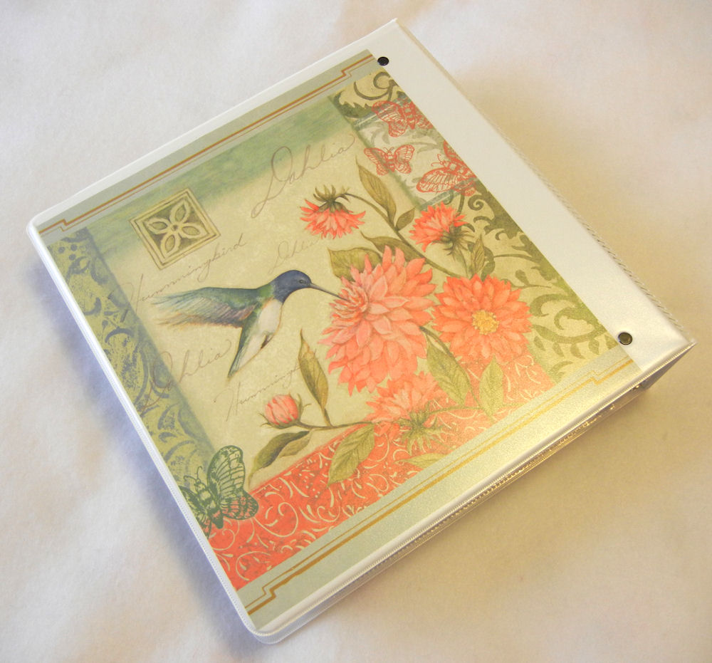 Finally, it was time to put everything together. I slid the spine labels into the binder, and decided the binder cover needed some spiffing up. I had just put away in a drawer my 2012 Susan Winget calendar, which was filled with images of birds, butterflies, dragonflies and flowers. I can never bear to throw away these beautiful calendars, so cutting some pages to the right size for my stamp binders seemed like the perfect opportunity to give new life to an old calendar.