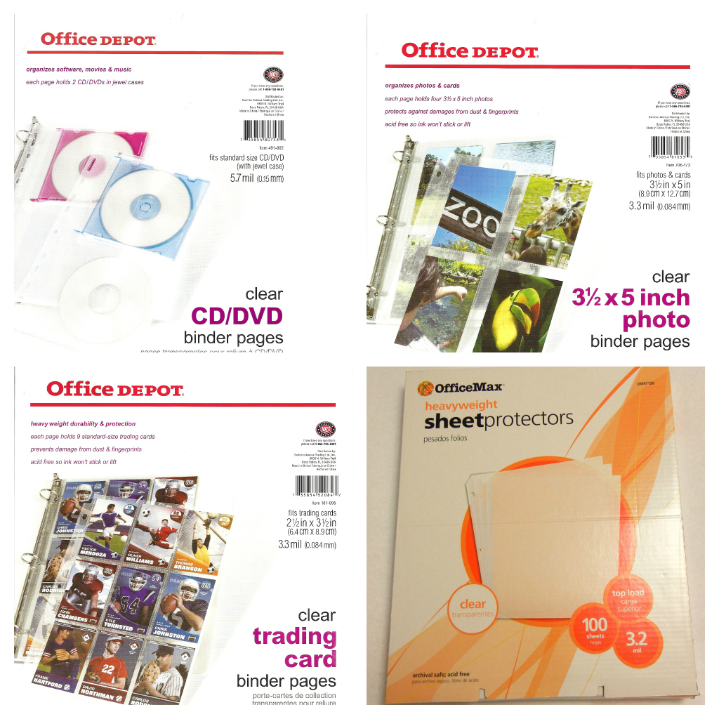 I decided to store my stamps inside three-hole punched vinyl sleeves which fit nicely into heavy duty, three-ring notebooks. Although this may sound like a commercial for Office Depot or Office Max, I located most of the supplies I needed at these two stores, with one stop at Archiver’s for adhesive dots. I discovered that vinyl sleeves come in many different varieties that seem to fit whatever size acrylic stamp you own. The ones I deemed most helpful included 2-count CD/DVD binder pages, 3-1/2 x 5-inch photo binder pages, trading card binder pages, and 8-1/2 x 11-inch clear sheet protectors.