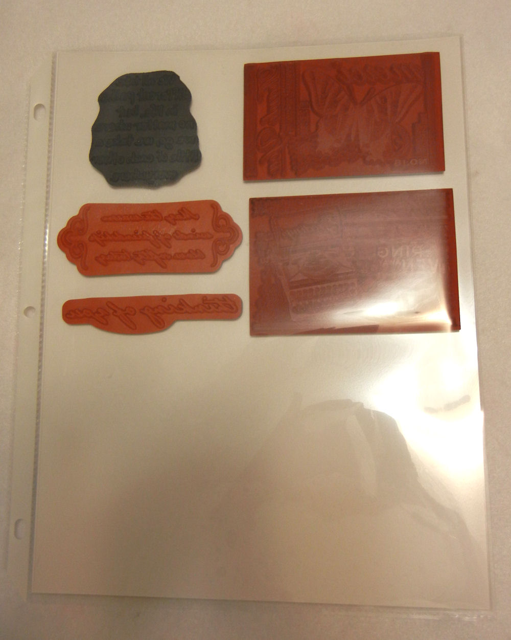 Yesterday I shared with everyone the acrylic stamp storage solution I implemented—a three-ring binder system with vinyl sleeves for every stamp. At the same time, I promised to share my storage solution for rubber cling stamps, anticipating that a similar system would work. Rubber clings are unmounted rubber stamps, or stamps that are not attached to a wooden block.