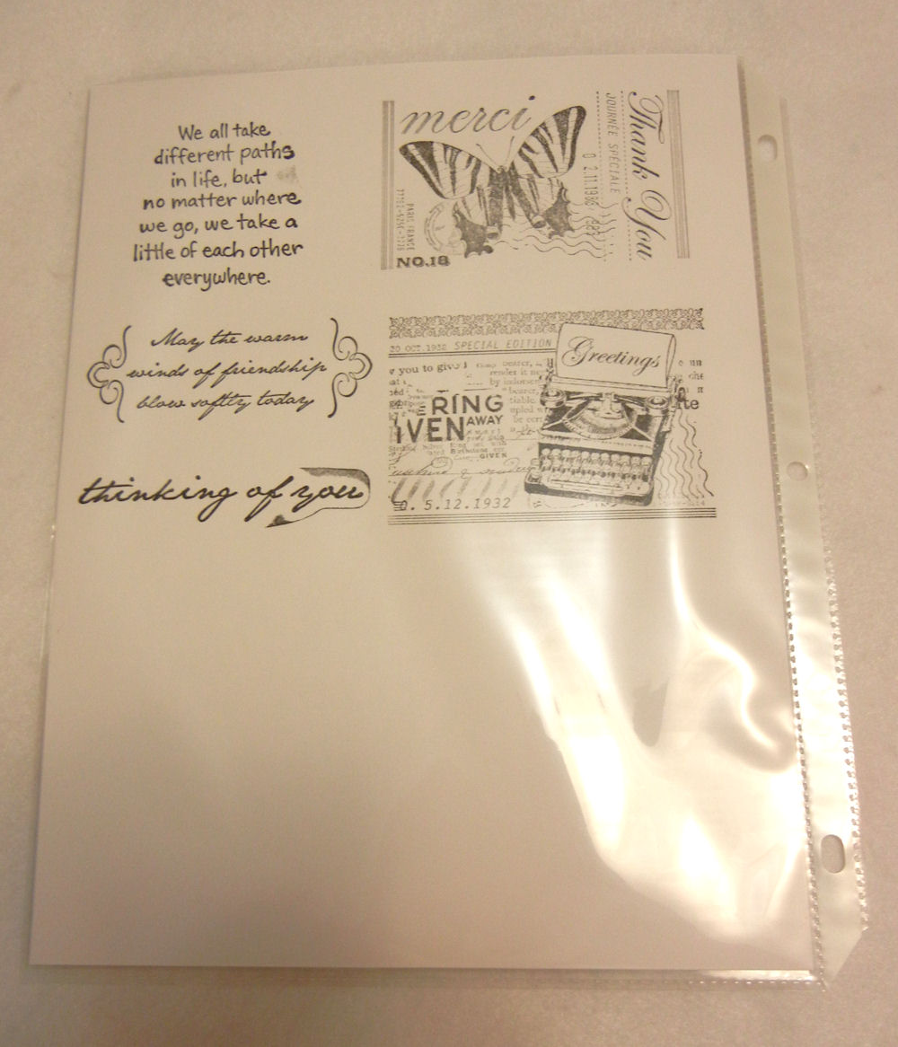 - Each vinyl protector page of rubber cling stamps contains a sandwich of three sheets, giving the page stiffness: an overhead transparency to which I adhered the clings, and two sheets of white card stock, one of which is stamped with the rubber cling’s images.