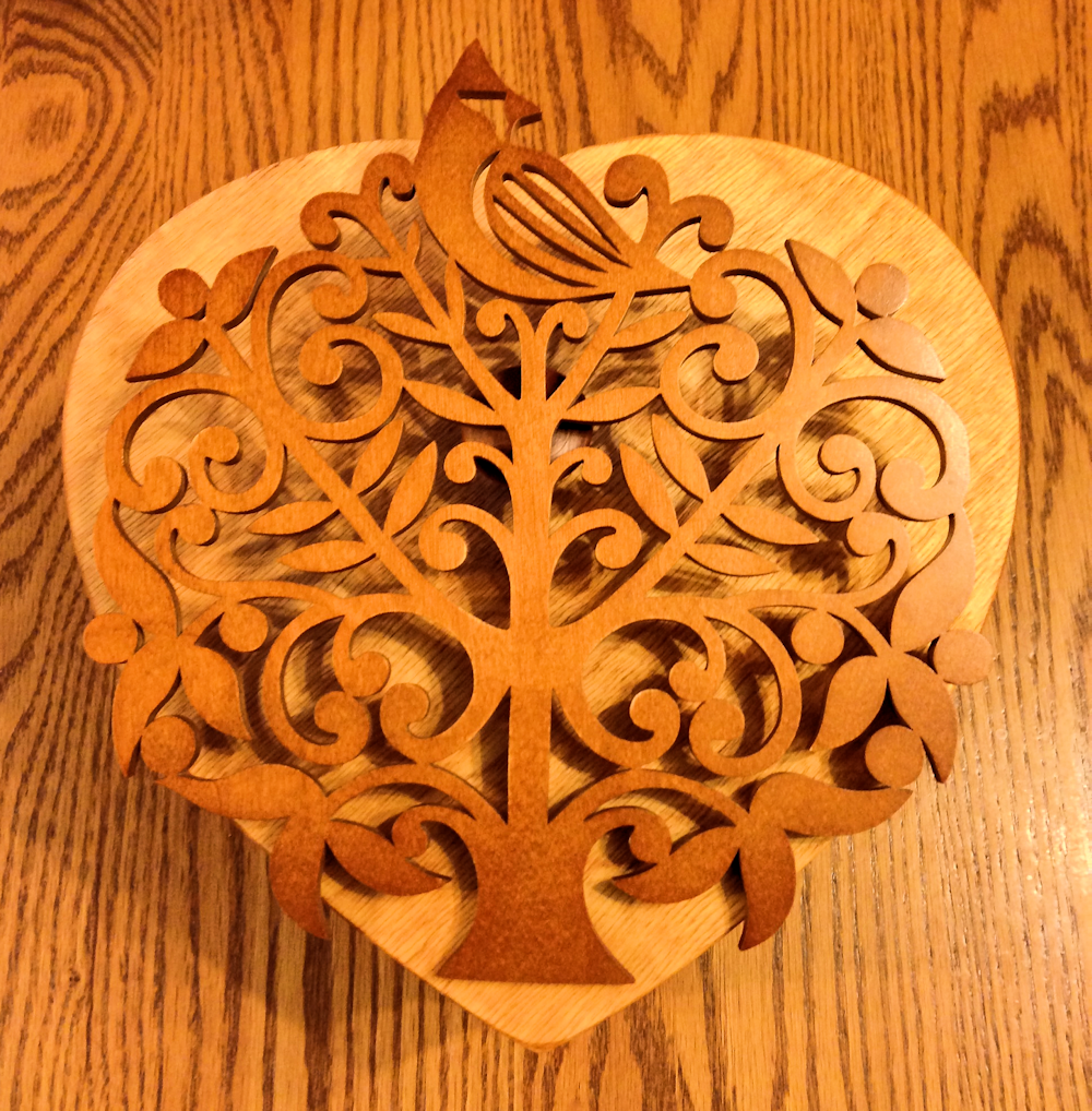 Knoxville is not the only place where we enjoyed art. As we have done in previous years, we stopped at the Kentucky Artisan Center in Berea, Kentucky. According to a 2012 American Style list, Berea ranked 21 in a list of 25 small cities of fewer than 100,000 people, representing “arts destinations.” Indeed, you’ll find regional art well represented not only at the Artisan Center, but also in the town of Berea. This year the Kentucky Artisan Center celebrates its 10th anniversary with exhibits by 52 artisans who have worked with the Center since its opening in July 2003. The treasure I took home with me from the Artisan Center this year is the trivet below, although it will never be used in that way in my kitchen, but will instead be displayed on a wall or a stand. The trivet is a scroll saw sculpture designed by Louisville, Kentucky artisan Bob Diehl, who took his fascination with the German paper cutting art called Scherenschnitte to his material of choice: Baltic Birch.