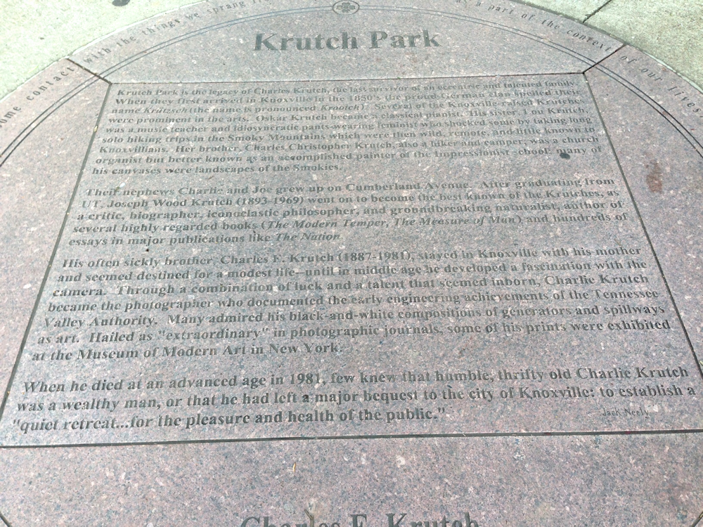 At the entrance to the park, engraved in the sidewalk, is a short biography of Charles Krutch. Around the edges of the sidewalk engraving appear the words of Charles’ younger brother, Joseph Wood Krutch, a writer, critic and naturalist: