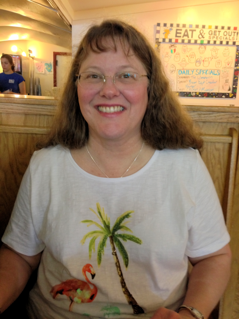 One of the places in town where we enjoyed eating breakfast was the Village Deli, which during the normal work week is so busy that people stand in line outside it, waiting to be served. Inside the restaurant is a sign reminding people that “Eat & Get Out Specials” are available. For two mornings in a row, I enjoyed a tasty buttermilk waffle, dotted with strawberries and sprinkled with walnuts, drenched in maple syrup. Yum! I ate it so quickly that I forgot to take a photo, but John snapped a picture of me, and you can see that I am more than satisfied with my breakfast.