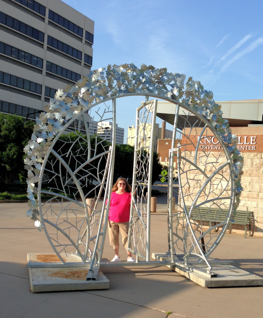 As we strolled on campus, we discovered other outdoor sculptures that are part of the Art in Public Places effort. You can view many of the sculptures, in fact, by visiting the Facebook page HERE, and discover how the sculptures were moved and assembled for exhibition purposes. The sculpture below, “Oak Leaf Horizon,” can be found in front of the Knoxville Convention Center. Designed by Jim Gallucci, it is made entirely of galvanized steel.