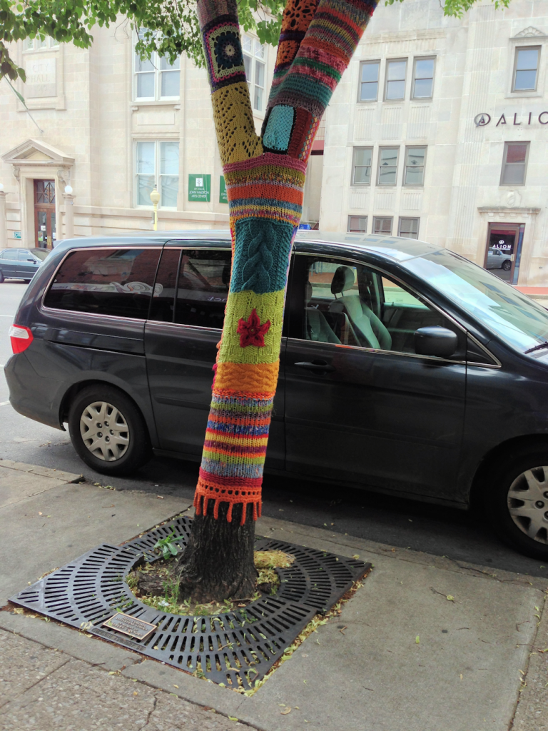 For his part, John learned a new term in Bloomfield, yarn bombing, when we visited Yarns Unlimited on Walnut Street and he saw a tree outside the shop, garbed in crocheted and knitted blocks of colorful yarn.