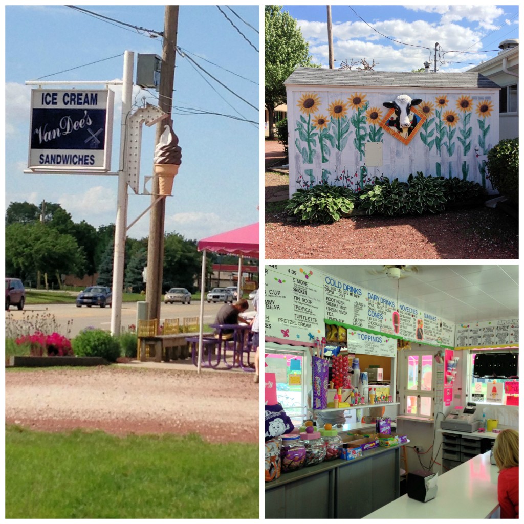 Earlier this week John and I drove north into nearby Johnston for dessert after dinner. We stopped at Van Dee’s Ice Cream, an old-fashioned ice cream stand that might remind you of life in the 50s and 60s. Facing the street is a sign announcing the family that has owned and operated the ice cream stand for as long as we’ve lived in Iowa, maybe longer. In the back of the stand is an outbuilding, likely for storage, on which is painted a colorful mural of jaunty sunflowers framing a dairy cow. And on the inside, you can pull up to the counter, seat yourself on a padded swivel stool, and order a shake, malt, ice cream sundae or whatever treat captures your appetite.