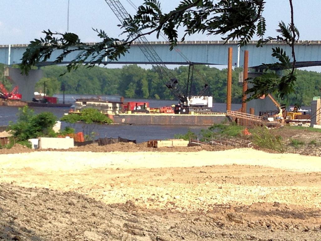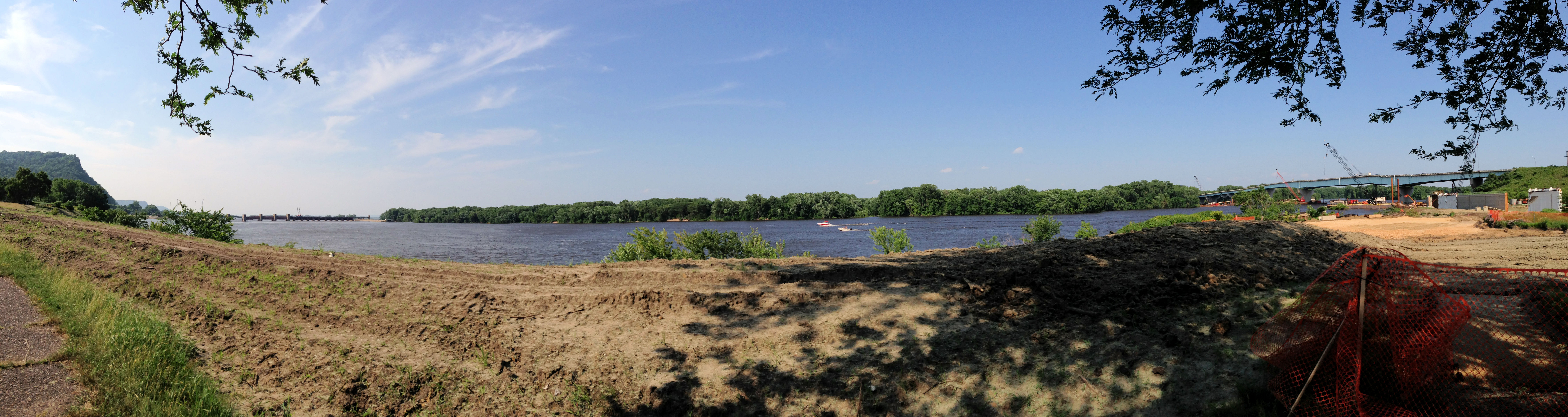 Large cranes and construction debris provide evidence of a new interstate crossover being built in the vicinity of the Mississippi River between Dresbach, Minnesota and LaCrosse, Wisconsin.