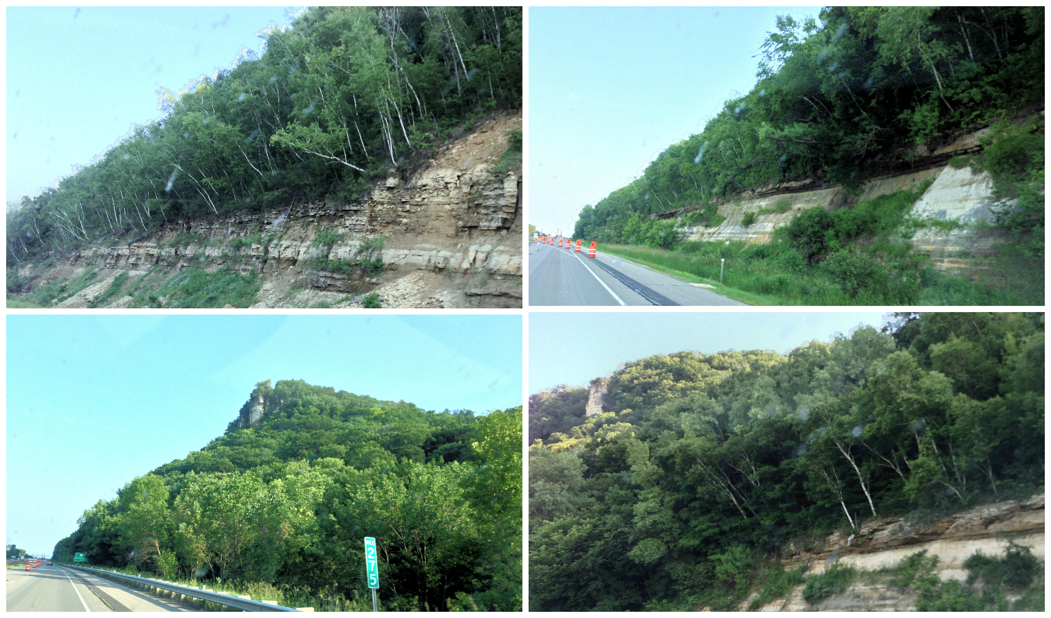 Much of the Midwest was at one time covered by glaciers, but as you descend into the Mississippi River Valley, the road on either side is edged with sedimentary bluffs and roadcuts of limestone, sandstone and dolomite, which represent areas the glaciers may never have touched. According to a sign posted at the Enterprise rest stop in southeastern Minnesota: