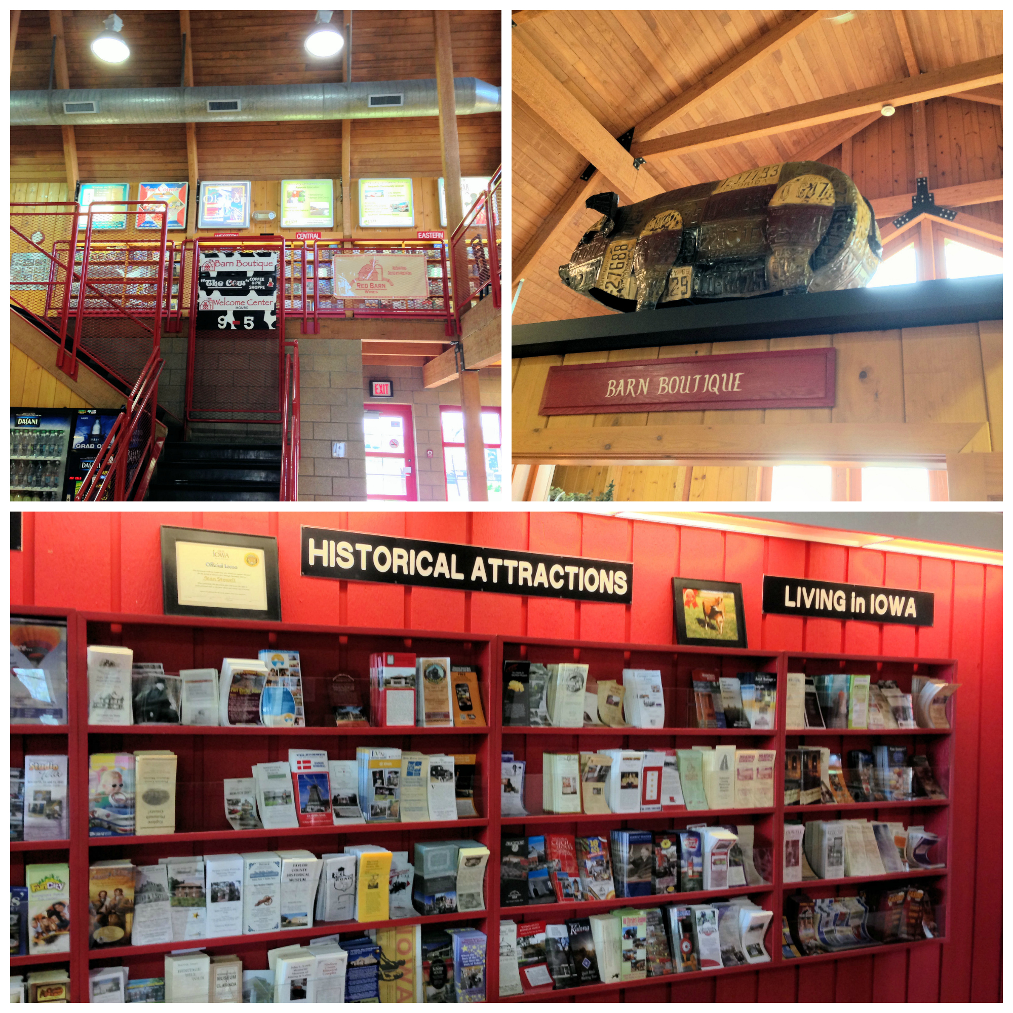You’ll find restrooms and vending machines downstairs, but if you climb the stairs, you’ll discover sightseeing brochures, booklets and maps about every interesting spot in Iowa that you can imagine. Sprinkled throughout Iowa, in fact, are attractive welcome centers that provide free visitor information. There is also a gift shop called the Barn Boutique that features the work of local area artisans.