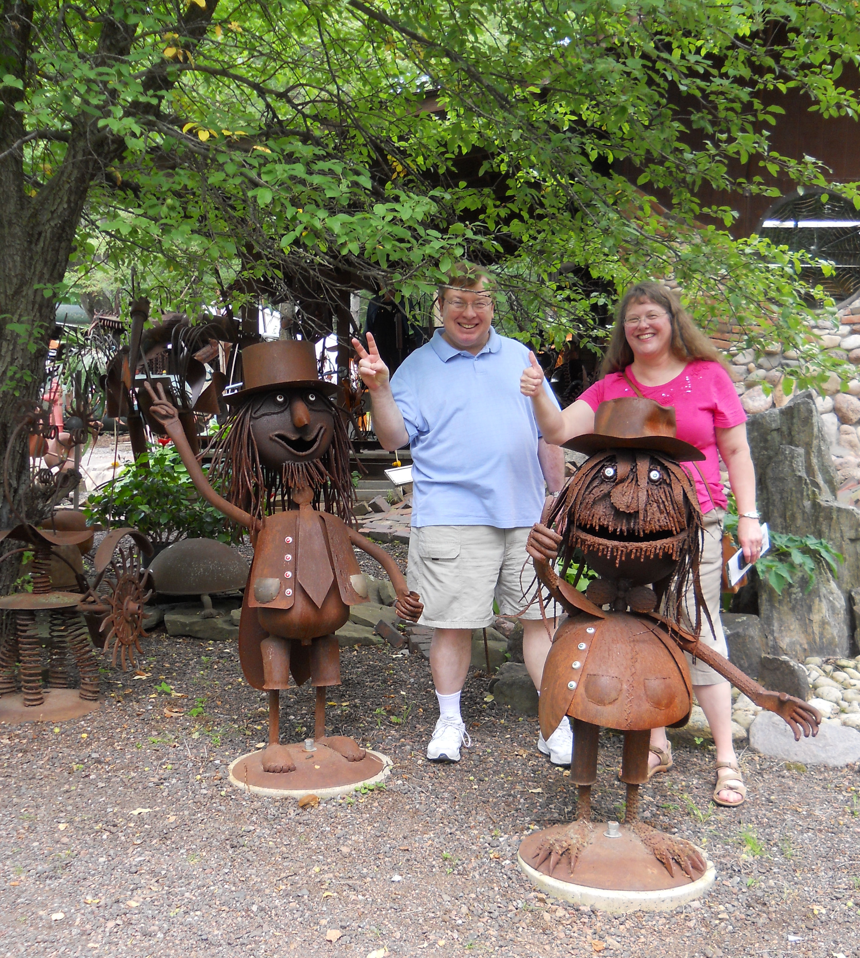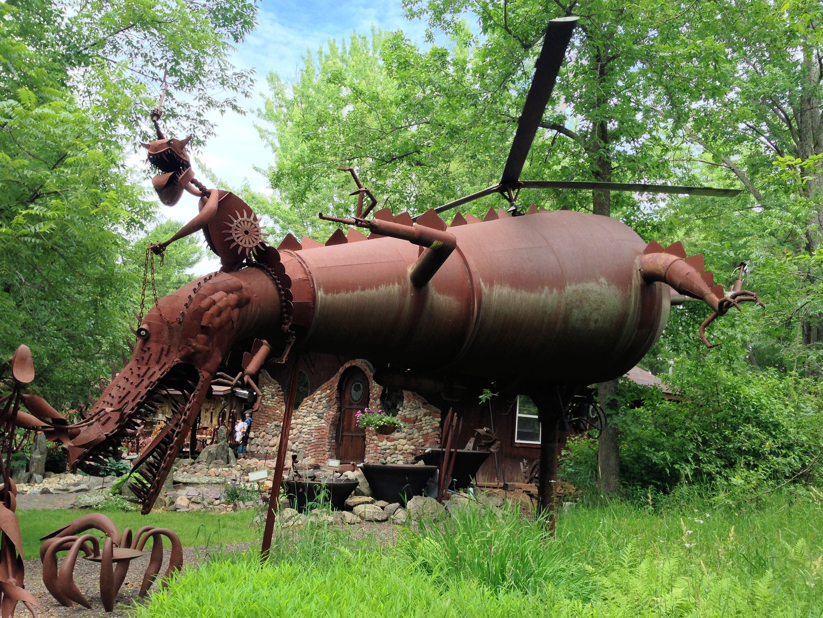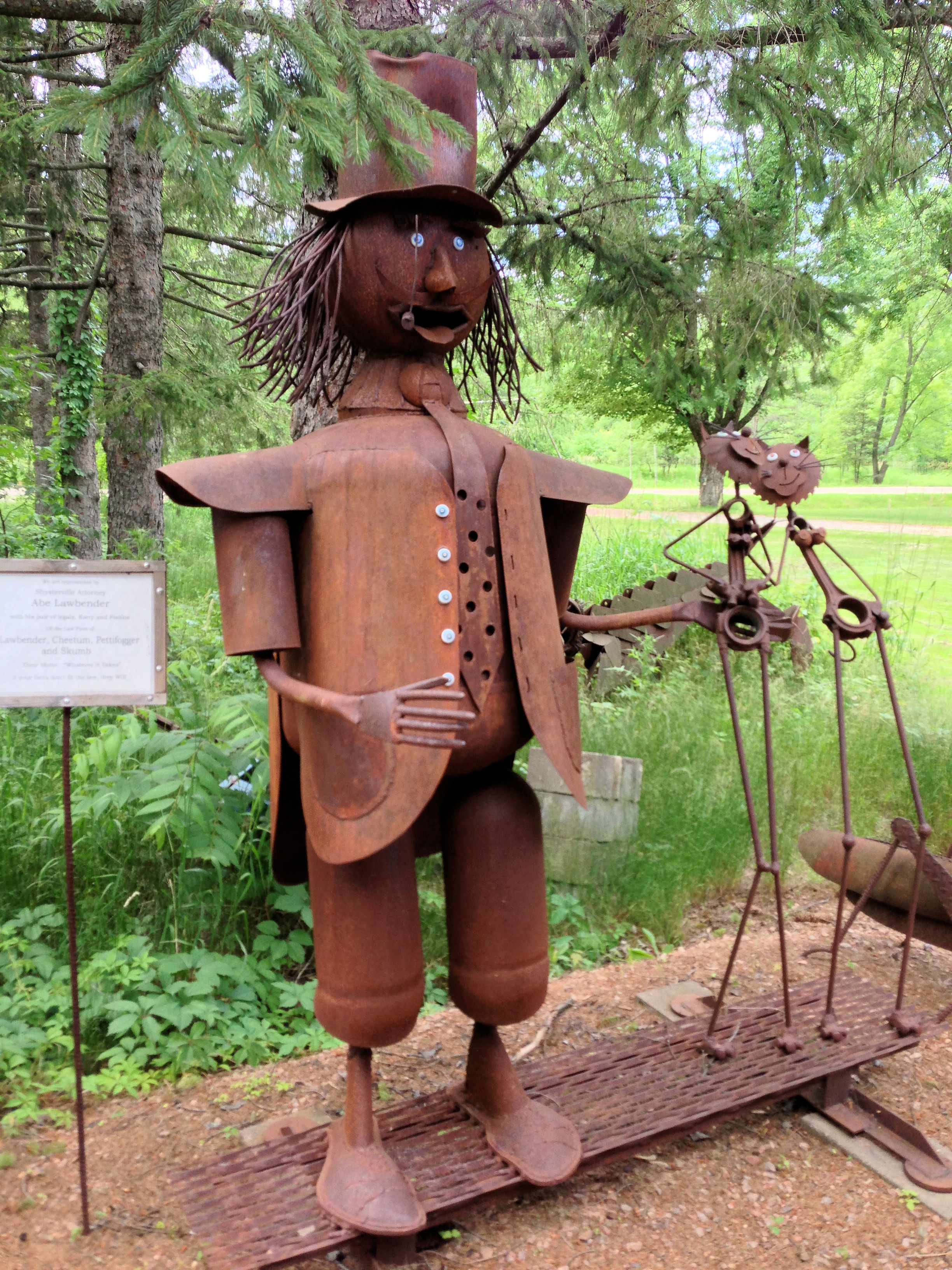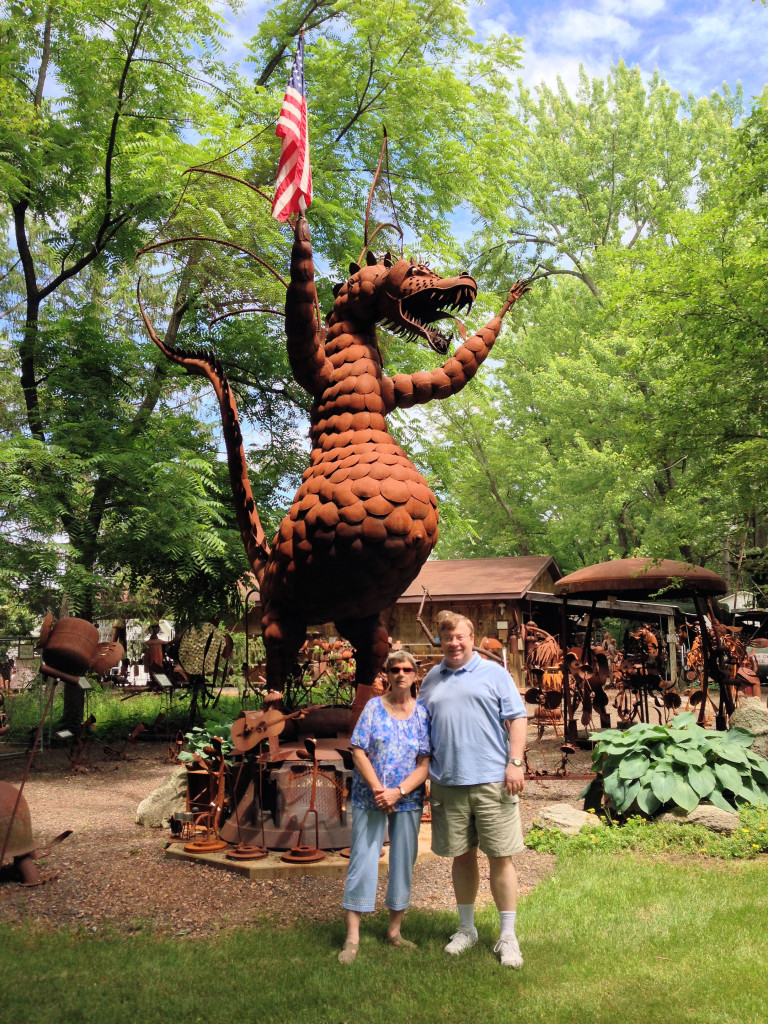 When John and I visited his mother last week in north central Wisconsin, we drove to Jurustic Park, four miles north of Marshfield, to visit a sculpture garden. Jurustic Park is located on the grounds of a private residence where Clyde and Nancy Wynia ply their art every day, sharing their creations with anyone who visits them. Next to their 1920s-style Victorian home on Sugarbush Lane sits a sculpture garden where the couple cleared out brush to create space for Clyde’s workshop and sculptures, as well as Nancy’s glass studio that in every way resembles a Hobbit House.