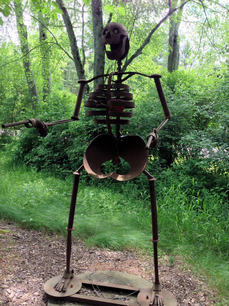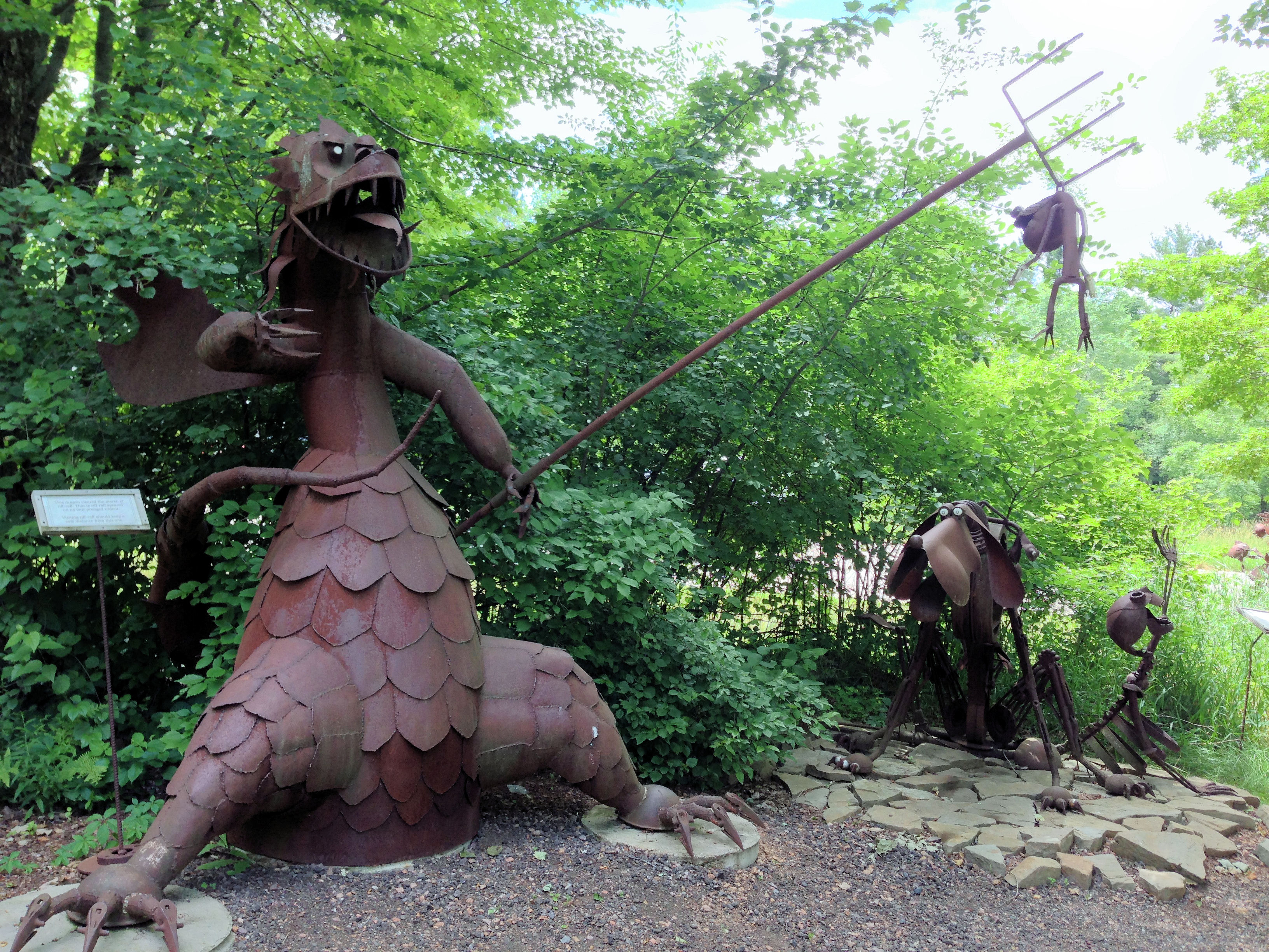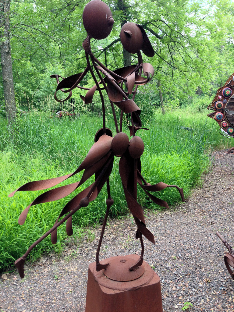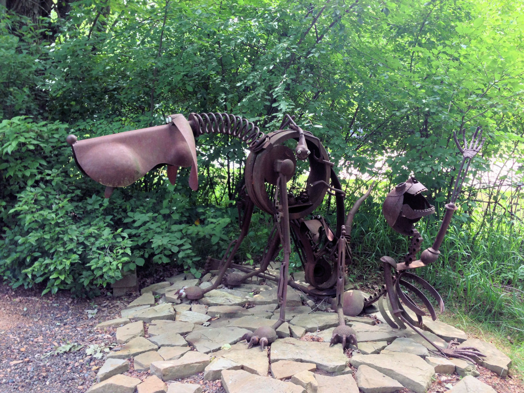 When John and I visited his mother last week in north central Wisconsin, we drove to Jurustic Park, four miles north of Marshfield, to visit a sculpture garden. Jurustic Park is located on the grounds of a private residence where Clyde and Nancy Wynia ply their art every day, sharing their creations with anyone who visits them. Next to their 1920s-style Victorian home on Sugarbush Lane sits a sculpture garden where the couple cleared out brush to create space for Clyde’s workshop and sculptures, as well as Nancy’s glass studio that in every way resembles a Hobbit House.