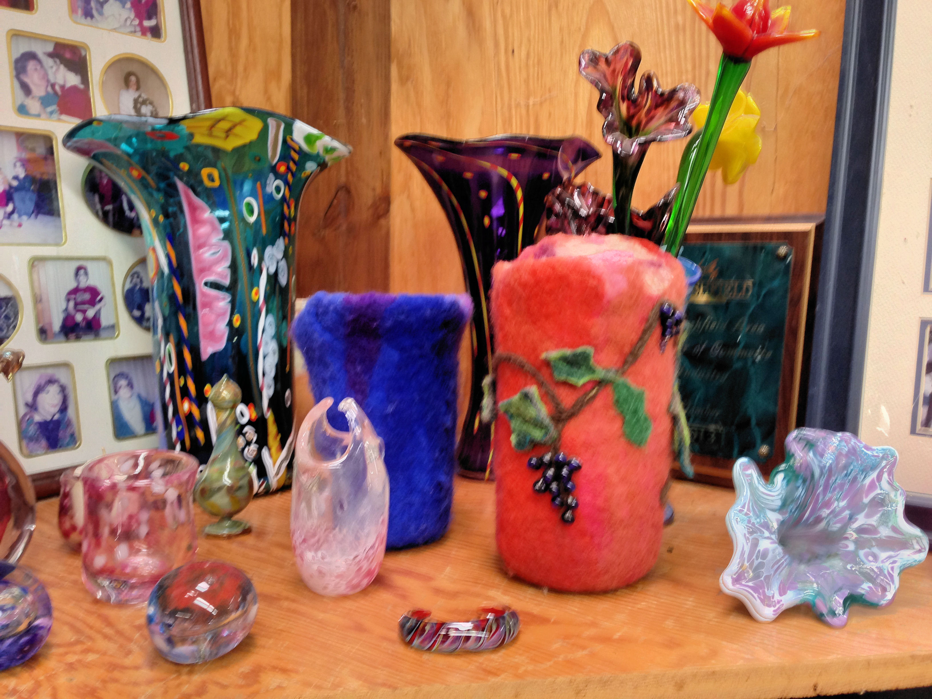 Because I also work with fibers, I enjoyed looking at Nancy’s felted wool work. The red vase was created using a combination of wet felting and needle felting.