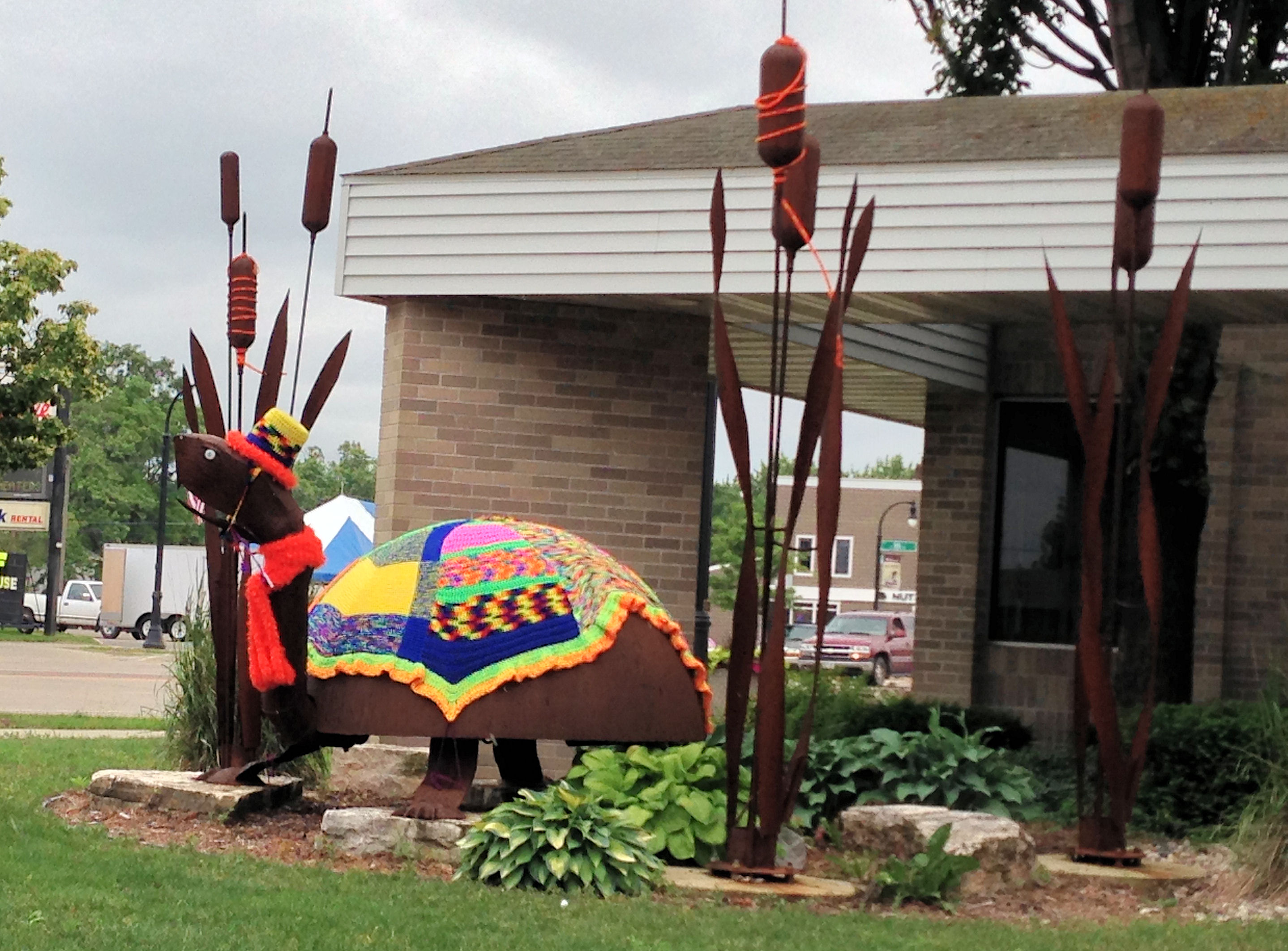 I was pleased to discover, when we drove into Marshfield after our visit to Jurustic Park, that Clyde’s work is appreciated locally. He has donated a good number of his sculptures, among them the turtle shown below. Amusingly, the sculpture has been yarn bombed, which somehow seems appropriate, given that Clyde does metal work and Nancy works with fibers.