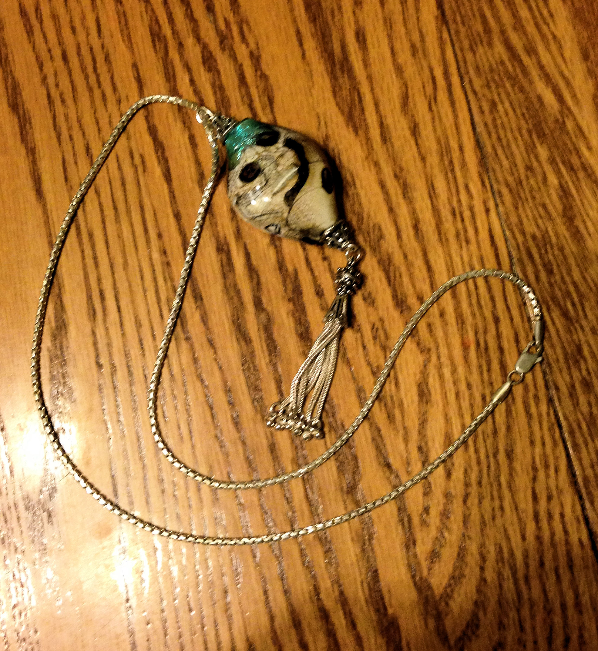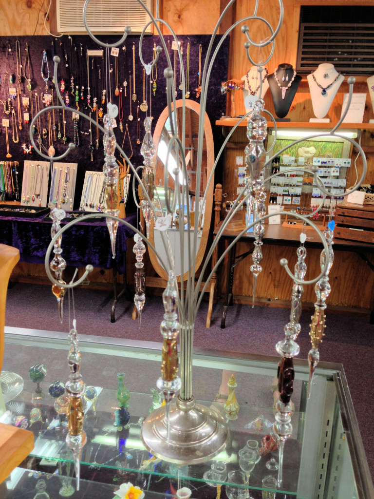 Although both Clyde and Nancy do sell their art, many of the pieces in both Jurustic Park and the Hobbit House are permanent display pieces. I fell in love with the necklace below. When you look at it closely, the textures in the pendant remind you of the beach, with sea creatures scattered in the sand. Nancy told me that it is actually silver inside the glass that gives it this appearance.