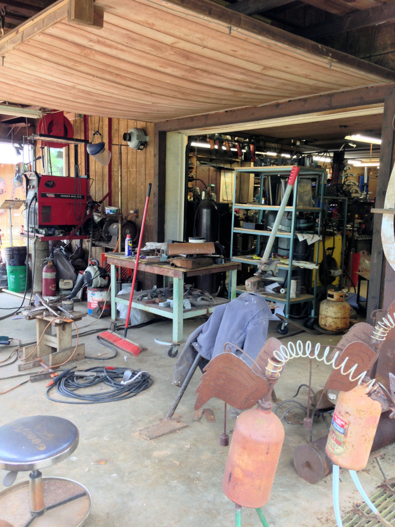 Both inside his workshop and stacked outside it are metal parts that Clyde says are the bones of creatures he has rescued from the local marsh. When visitors ask him where he gets his metal, he says, “Wherever I can find unattended, unattached metal. Lock your car.” He treats the metal with a mixture of salt vinegar and peroxide to give the sculptures their special rust patina. It takes years before this patina darkens, further enhancing Clyde’s tales about the creatures who lived millions of years ago in the MacMillan Marsh.