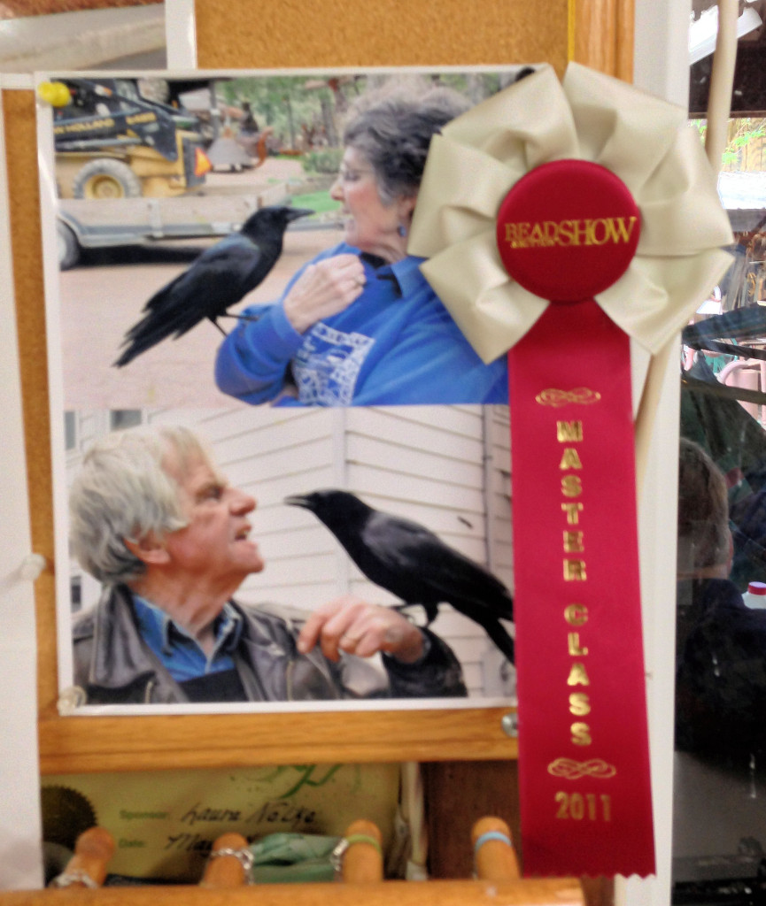 She explained that I was looking at the second crow for which they had provided care. The first crow, Jerry, was a baby when he fell out of his nest, featherless. Clyde and Nancy took care of Jerry until he was able to be released, and the bird hung around for four years. The current crow is Eddy, short for Edgar Allan Crow. If I remember Nancy’s story accurately, someone brought Eddy to them because they heard that the Wynias knew how to care for birds. Eddy appears to be recovered from whatever his ordeal was about, and spends his time visiting sculptures and the people it recognizes, alighting on them at will.