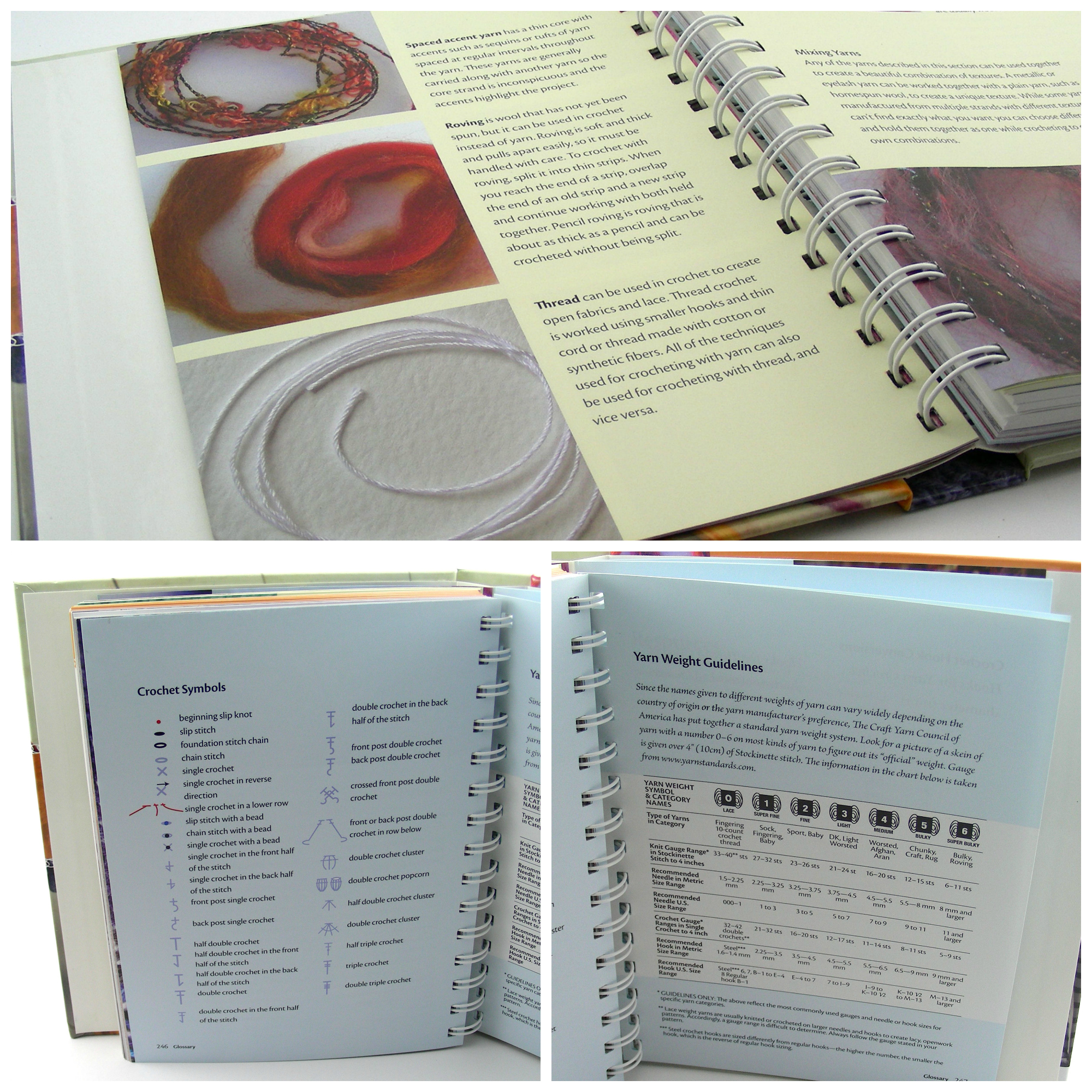 Top: Yarn discussion. Bottom, left: Crochet symbol chart. Bottom, right: Yarn weight guidelines.