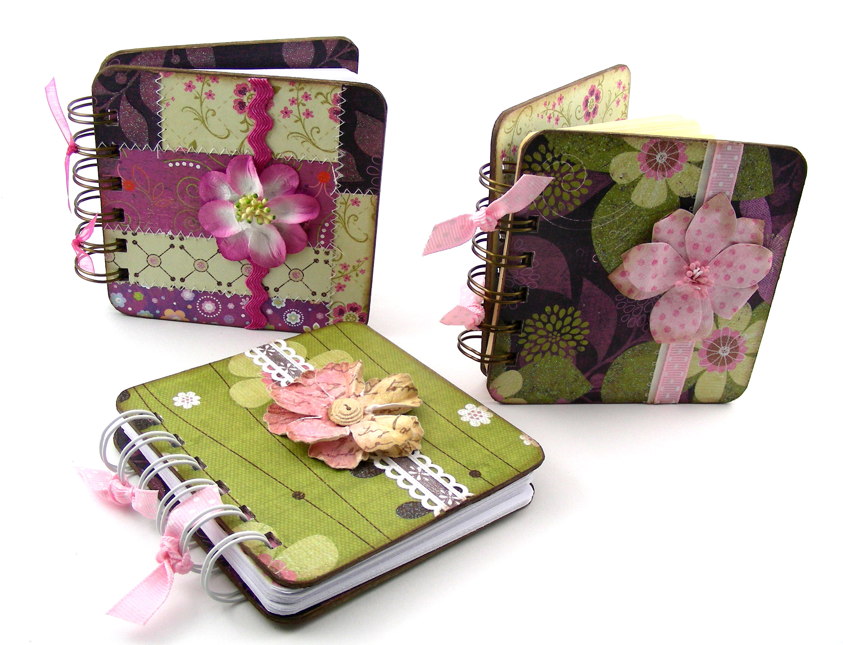 Before I bind the books, I round the corners of the covers and pages, sand and ink the edges of the covers, and then punch holes in both covers and pages. Then the owire is added and the book is bound, the covers get decorated (usually with a flower), and it’s time to photograph the books. They look like the photo below once all of these steps are accomplished. Okay, I fibbed a bit . . . I guess I can’t complete this post without showing you something that is actually finished.