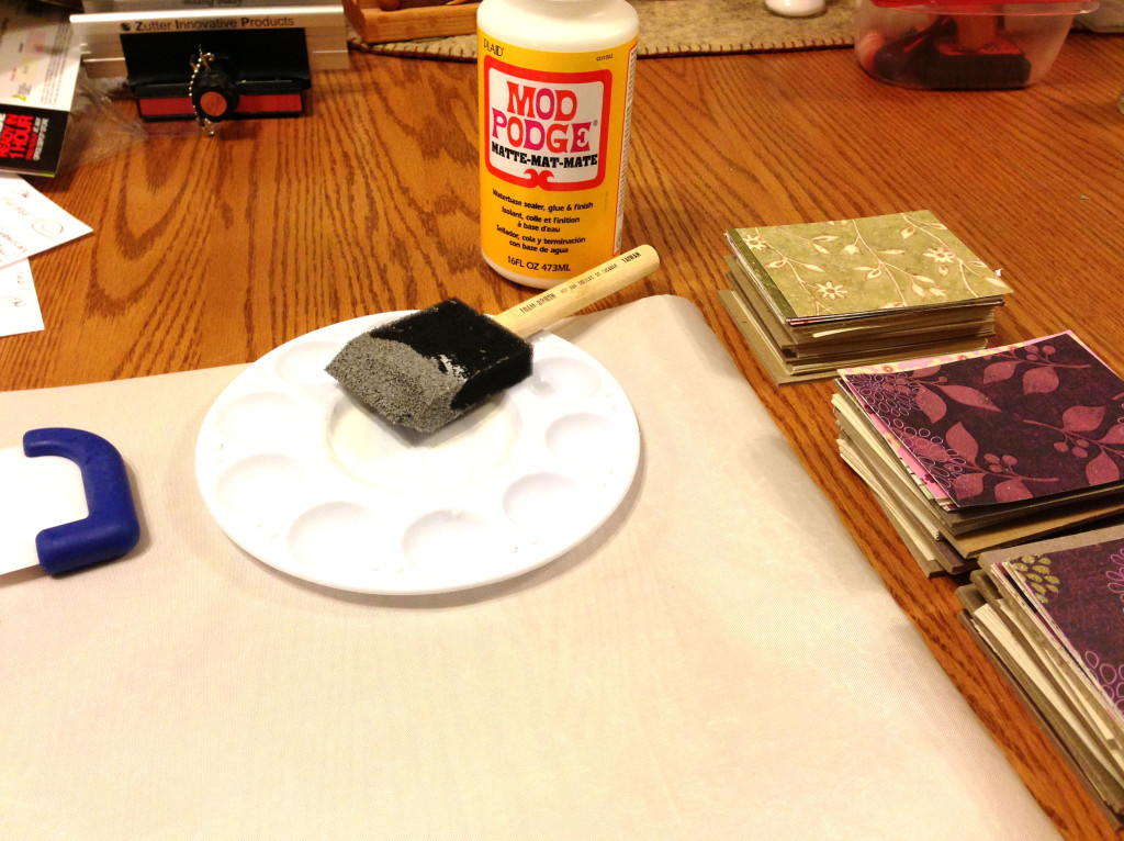 Today was Glue Day. I dug through my rectangles of chipboard and printed papers that make up the covers of my handmade books, and started adhering them together.