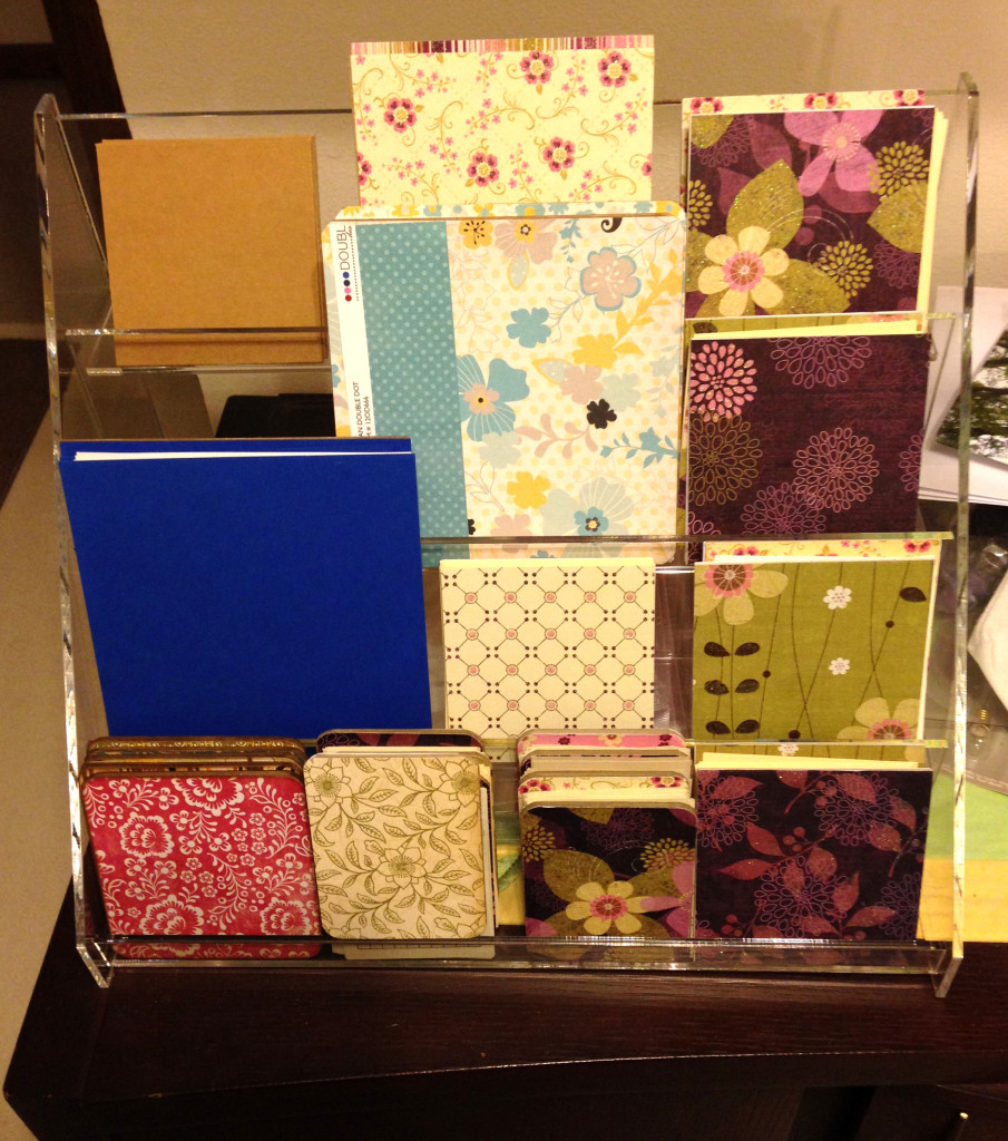 Tomorrow, when the covers are dry and flat, I will match them up with their inside pages. These are stacked on the acrylic rack below. There are all kinds of books here—the beginning of an Internet password book, a couple of lined journals, a Save the Date notebook, blank books, a couple of Creative Ideas Accordion Notebooks, and several half-finished mini clipboards.