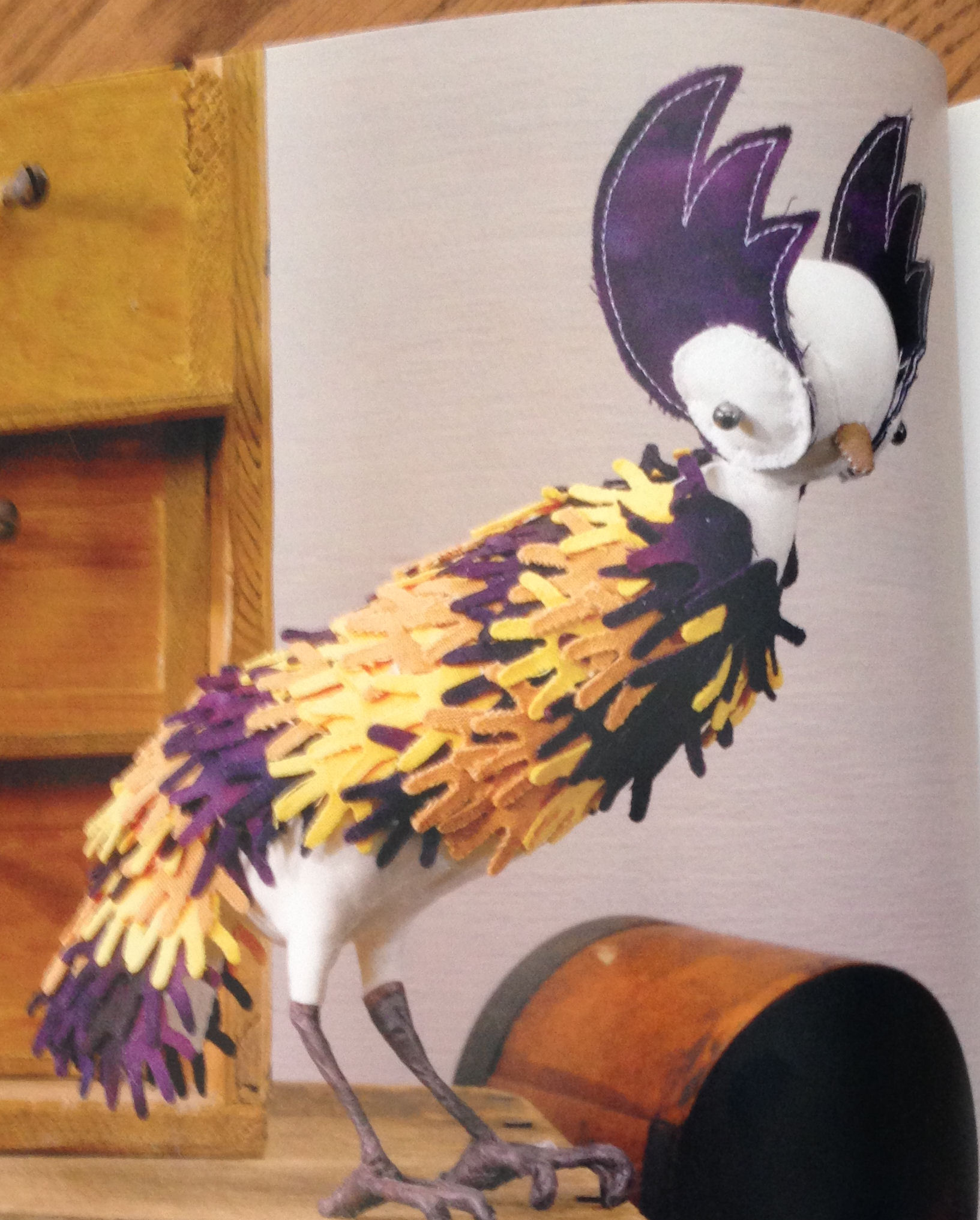 Abigail writes about the basic construction techniques for making your own 3-D bird sculptures from nothing more than cotton fabrics, wool stuffing, interfacing, fusible web, batting, floral tape and wire. She breaks down the components of creating a bird into the body parts, head, wings and tail, beaks and eyes. When you have learned the basics of assembly, you can produce your own designs. You can also re-create one of Abigail’s designs; she includes 40 of her projects in the book.
