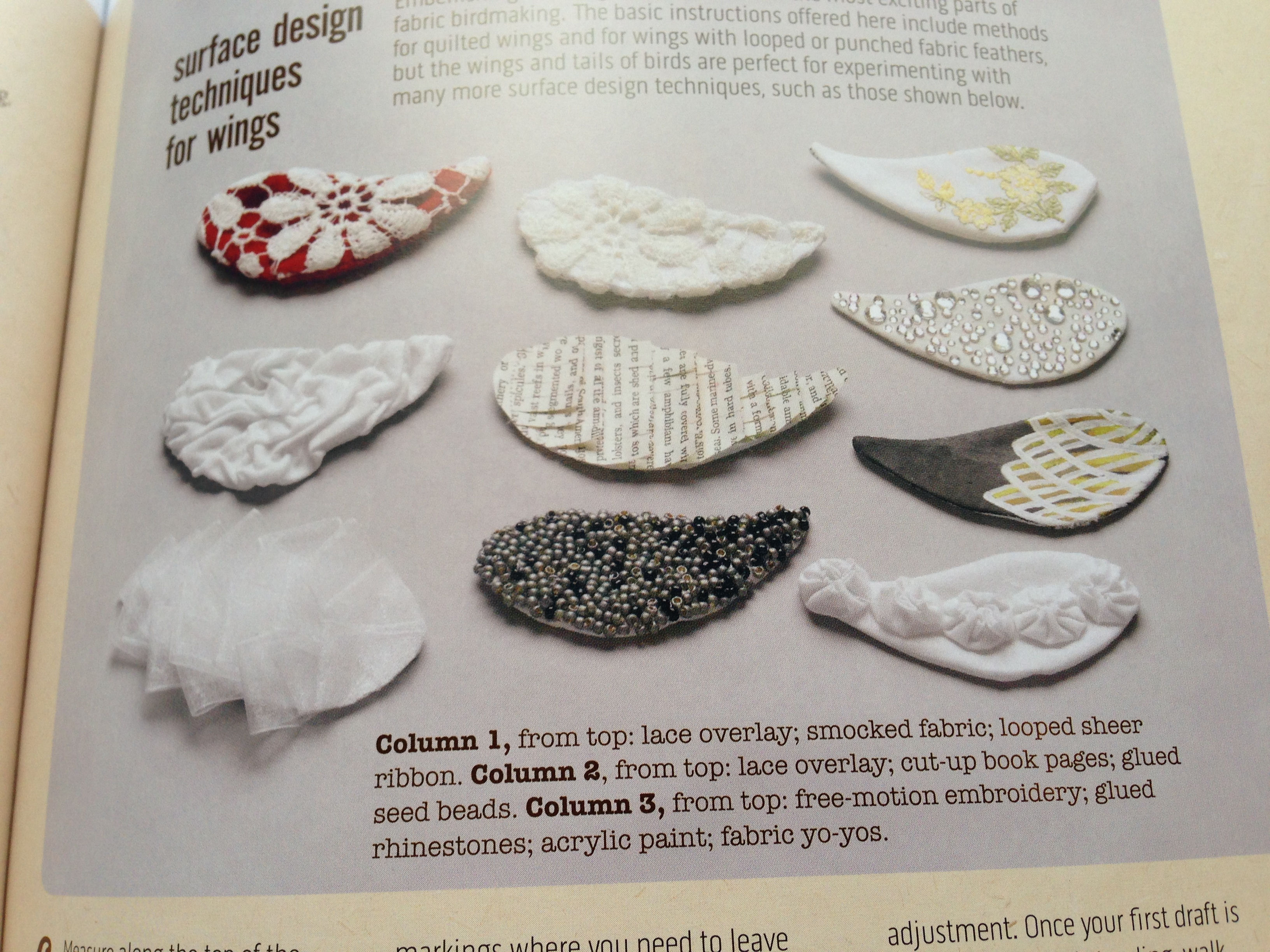Part of the fun of designing your own birds is decorating the wings. You can overlay lace, smock fabric, embellish with ribbon, cut up book pages, glue down seed beads, use free-motion embroidery, glue down rhinestones, use acrylic paints, or even sew on fabric yo-yos. The wings are a mixed media artist’s canvas, so use your imagination—your bird doesn’t have to be realistic!