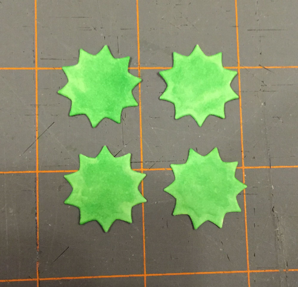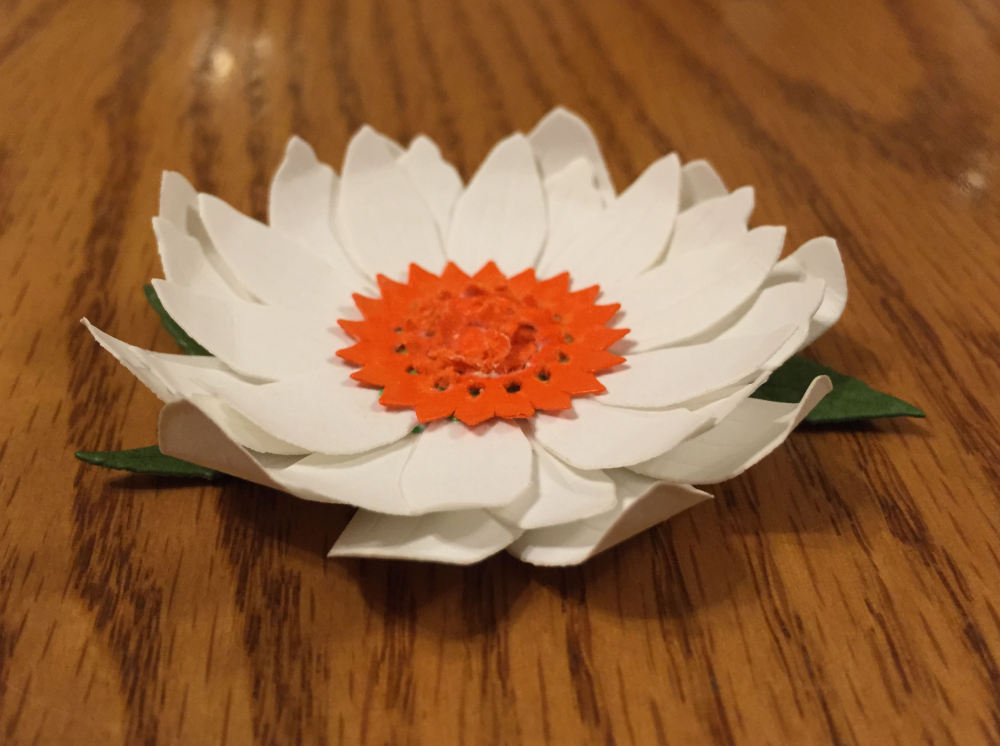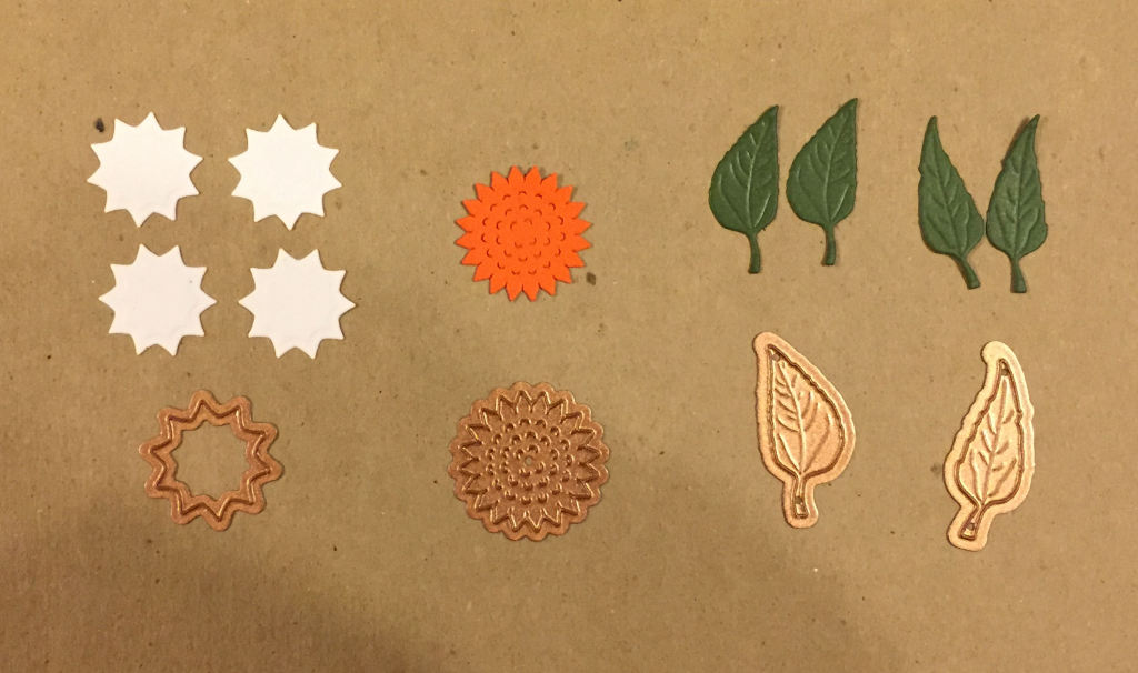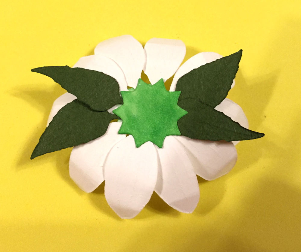 I then cut out 4 bases to which the petals are glued, 1 floret disc for the center of the flower, and 4 leaves. I figured I’d use the extra base for the bottom of the flower to help hold everything together.
