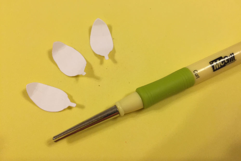 I curled each of the petals with a McGill® paper rolling tool, then dipped the stem of each petal in craft glue, and adhered it to a base.