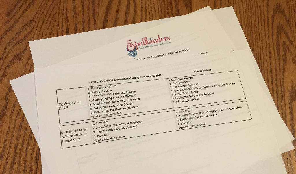 To use the die kit, you’ll need some kind of a die-cutting tool, whether that’s the Grand Calibur® by Spellbinders®, the Cuttlebugâ„¢ by Provo Craft®, the Big Shotâ„¢ by Sizzix®, or something else. Fortunately, Spellbinders provides a downloadable guide that tells you how to build a “sandwich” of parts and paper to run through your machine to cut or emboss the paper. If you click on the image below, you can download the guide.