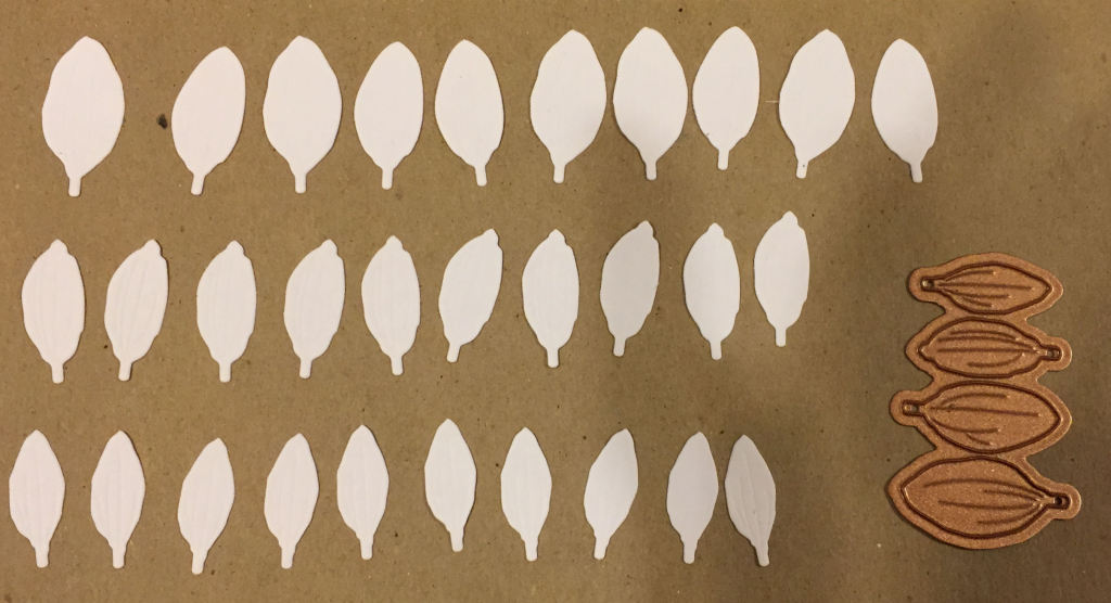 My own machine is a Big Shotâ„¢, so I followed the diagrams located beneath the flap of the die envelope: cut and emboss 10 extra large petals, 10 large petals, 10 medium-sized petals, and 10 small petals. This produces four layers of petals.