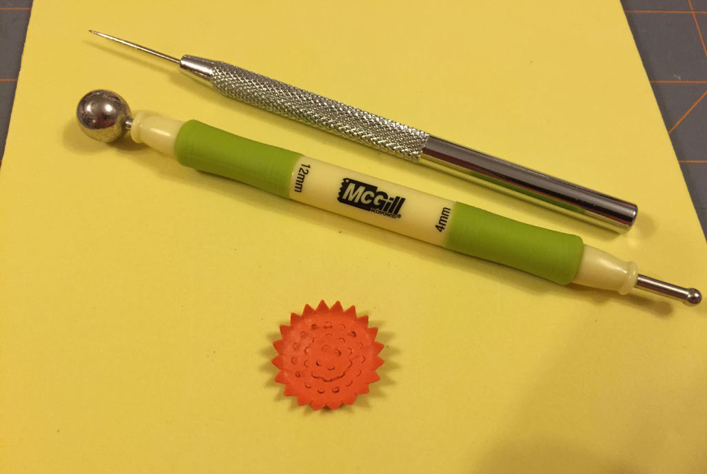 Next, I “rounded” the orange center of the flower using a McGill® stylus. I pierced the slits with a paper piercer to give the center some texture.