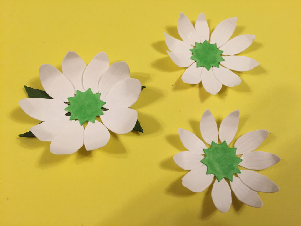 I made three layers of flowers in graduated sizes, added leaves to the bottom of the largest layer, and adhered a base to the bottom of the flower to add strength to the fragile construction.