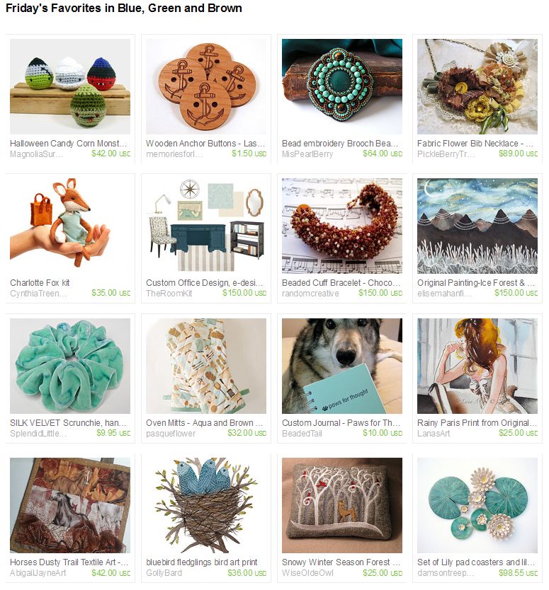 I missed the last few Fridays of favorites, and it’s late Friday night as I post this Etsy treasury in blues, greens and browns, but I hope you’ll enjoy these selections nonetheless. Many of you are probably attending craft shows at local venues, either as a shopper or vendor, or both—and I am, too. Two weeks ago, I sold at my best craft show ever in Clarinda, Iowa, and I have been working on restocking items and filling custom orders ever since. There will be more about that event in another post, but in the meantime I hope you enjoy these really lovely items from talented Etsy artisans. Just click on the image below to link up with the treasury on Etsy.