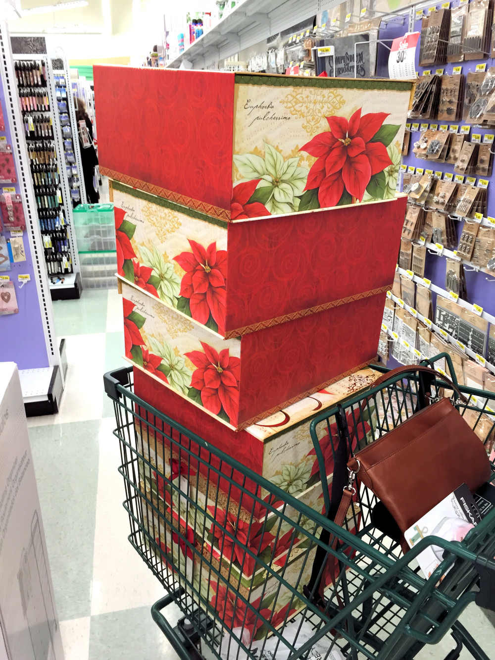 Although my handcrafted books are not displayed flat, they still need to be placed closer to eye level. One way to do so is to stand table legs on bed risers, and cover them with a long table skirt or table cloth. My tables are lightweight, though, and easily nudged, so I have visions of someone knocking over a riser, and all of the merchandise toppling onto the floor. Not a great way to make an impression! Alternatively, I may raise the height of my tiered acrylic display racks by placing boxes beneath them. When holiday gift boxes were on sale at my local fabric store recently, I bought half a dozen of them. They can also serve as storage space for the books when I transport them.