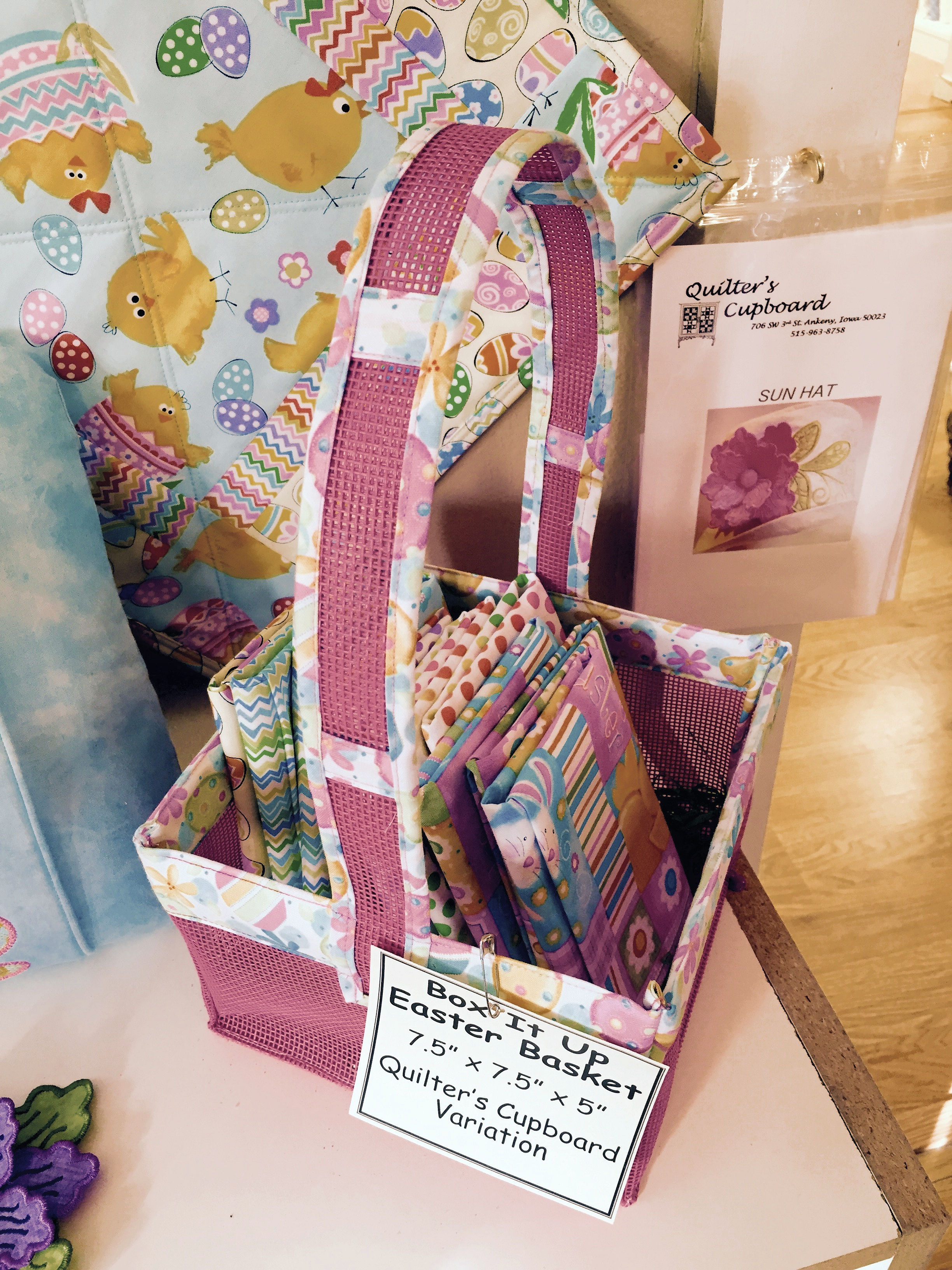 Next is Cindy’s Box It Up Easter Basket, adapted from Box It Up by Stitchin’ Sisters. The Easter basket is made with pet screen vinyl, fabric, and a carpenter’s metal measuring tape. When my husband saw the pattern, he told me to stay away from his workbench.