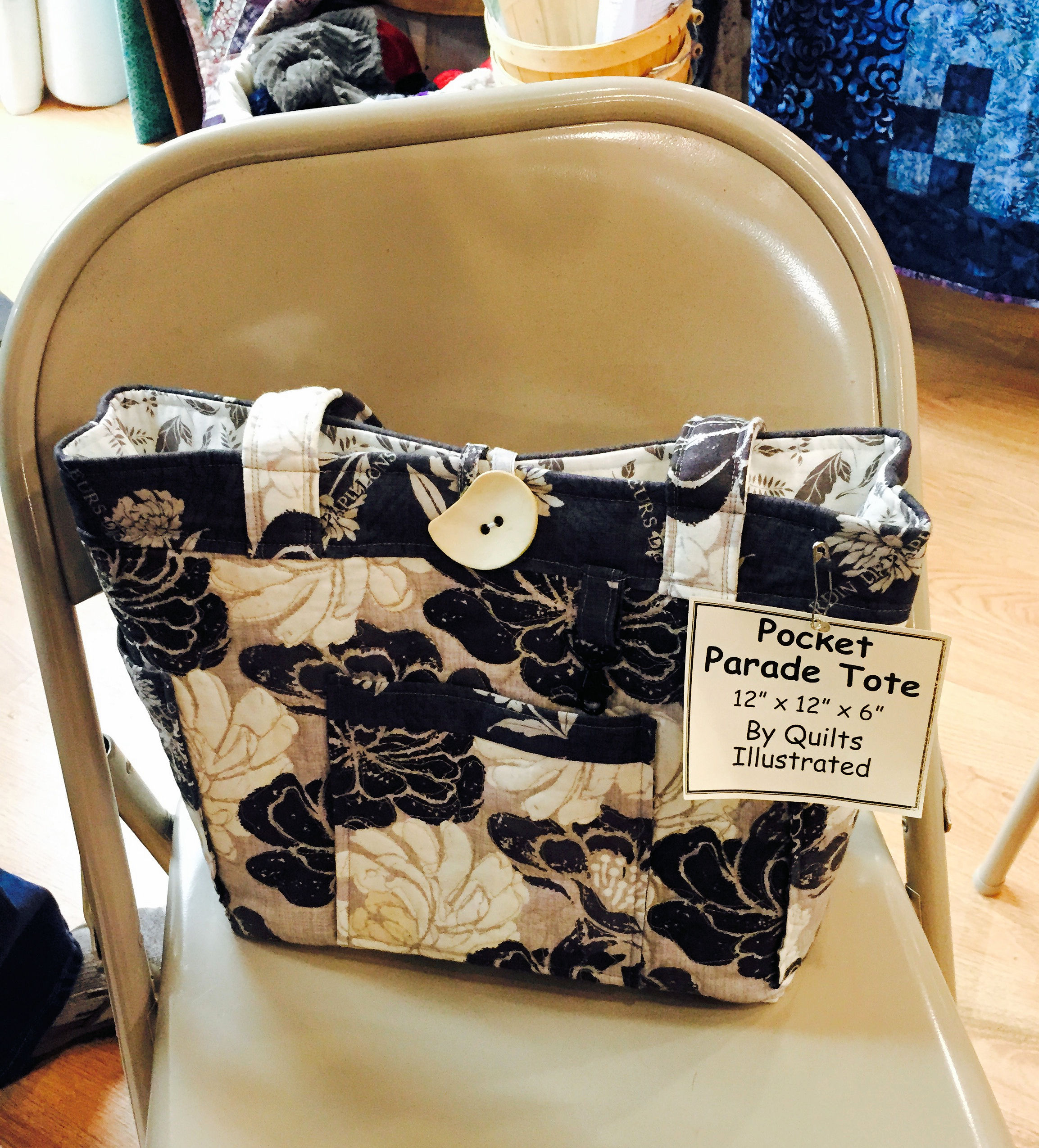 You’ll never find a structured tote bag with as many pockets as Pocket Parade Tote, designed by Penny Sturges of Quilts Illustrated. The sample we admired at the Purse Party featured fabric that was quilted first, then incorporated in the bag.