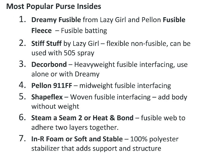 One of the useful things that was shared at this year’s Purse Party was a list of fusible products that work well with bags, which I find quite helpful, especially because these are products that my quilt shop carries. Often patterns will recommend fusibles that you can find only on the Internet.