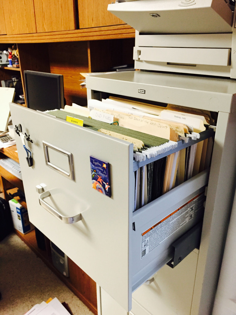 The solution, obviously, is to use the top file drawer in the steel cabinet we keep in the basement. Not even two steps away is the wireless printer to which I send copies of online orders and purchases. Duh. Should have done this long ago. Everything for 2015 is already filed away neatly.